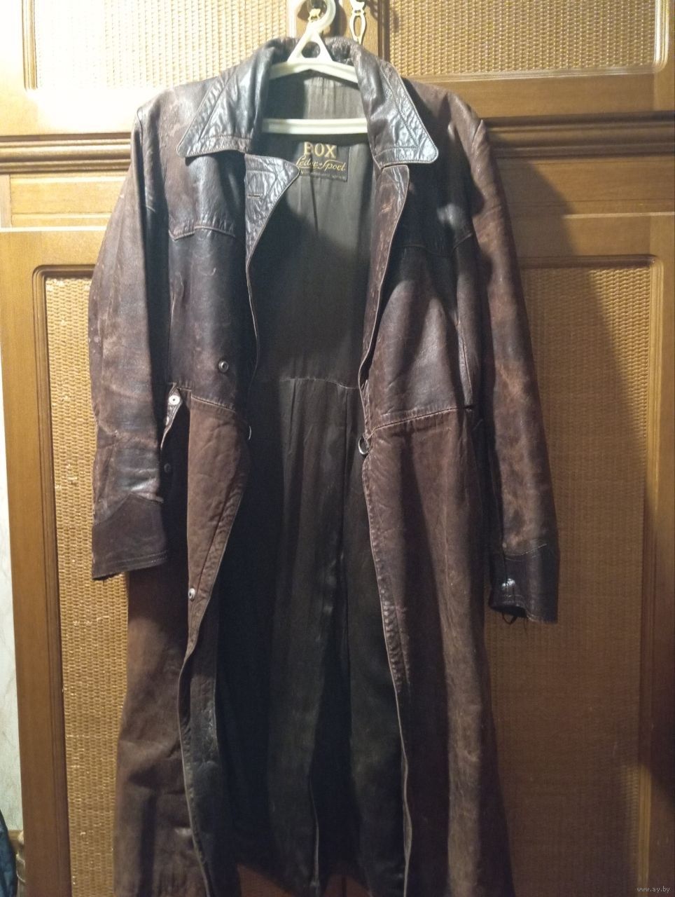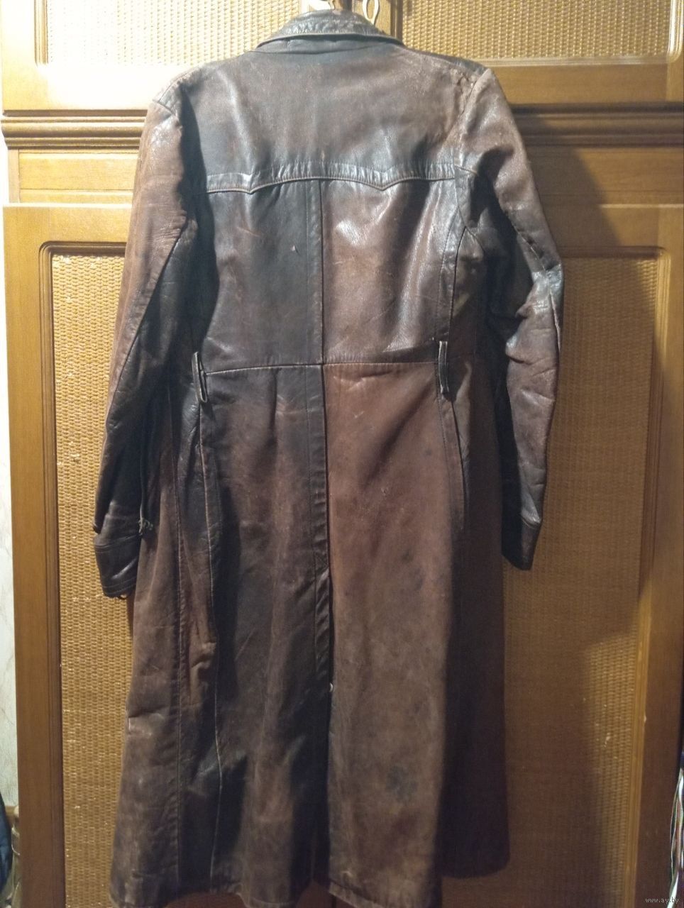 Искусственно состаренный изношенный винтажный кожаный плащ коричневого цвета. Унисекс. Есть потертости и дырки. Нет 1 кнопки, карманы - рваные.