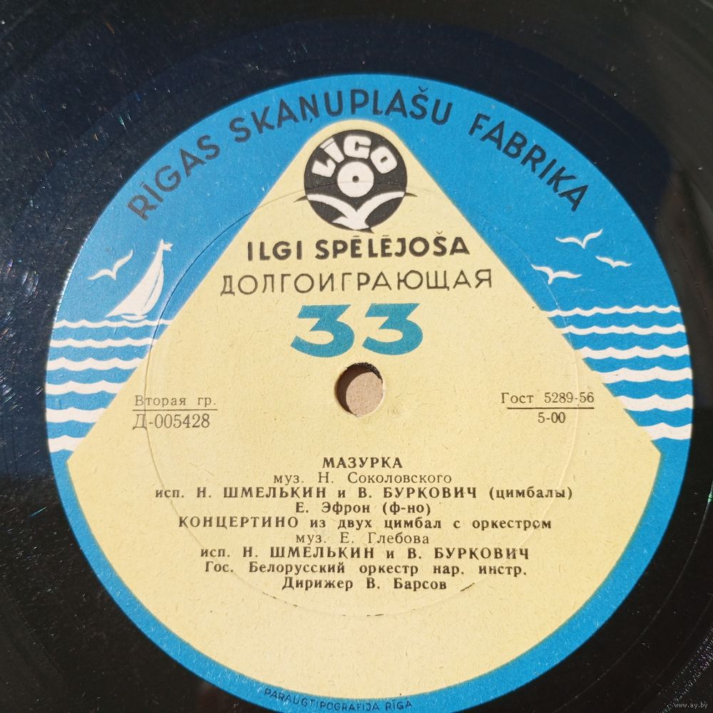 Пластинка (8") - Н. Шмелькин и В. Буркович (цимбалы), Е. Эфрон (ф-но); Гос. Бел. оркестр. нар. инстр. (И. Жинович) - Произведения Н. Соколовского, Е. Глебова, В. Оловникова и Н. Аладова - РЗГ, 1961 г