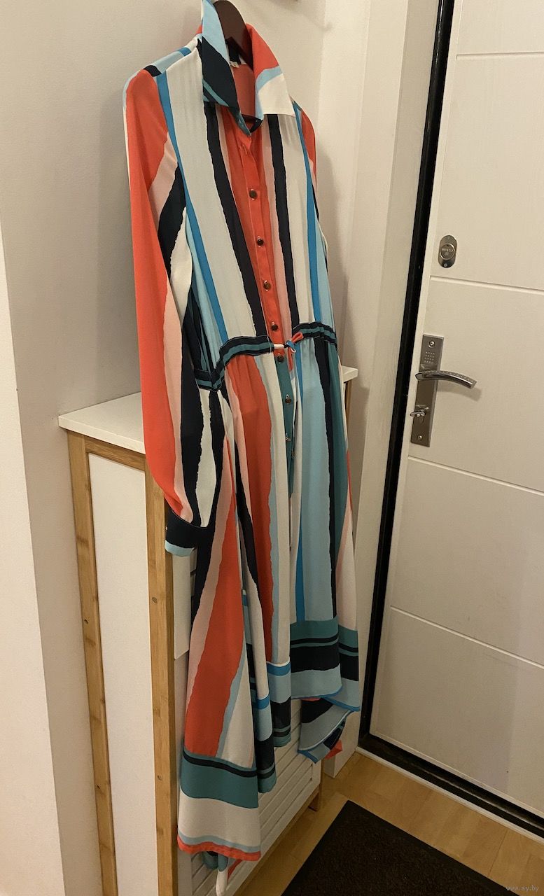 Платье-рубашка очень красивое, подойдет на размер S/M. Бренд Stilife, маркировка 36. Состав ткани - полиэстер, но приятный к телу, не мнется, летом в нем не жарко - проверено!) Замеры: длина по спинке 110 см, по бокам 130 см, по плечам 37 см, по груди 49 см, по бедрам 70-74 см, длина рукава 59 см. Состояние отличное, дефектов нет.