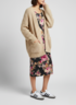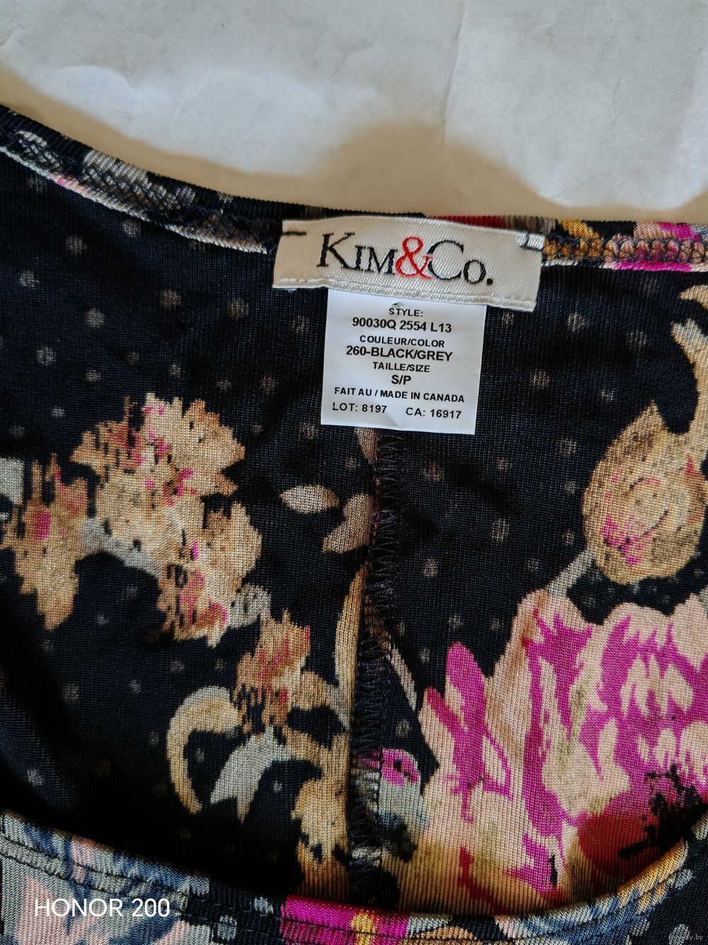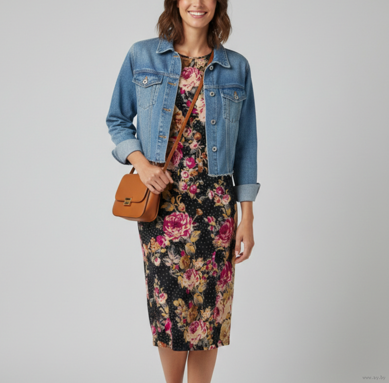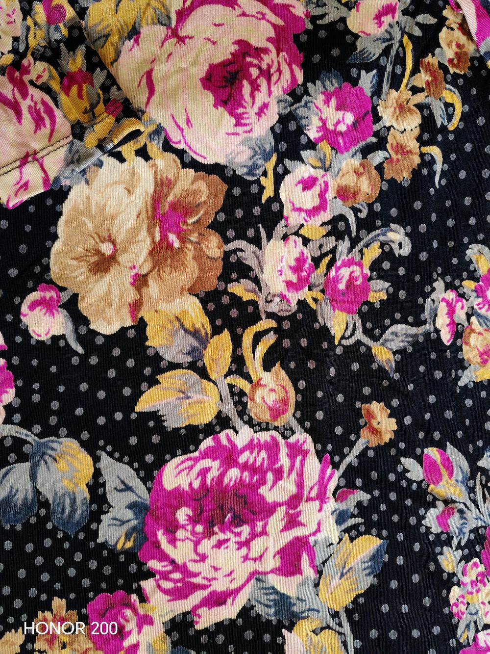 Художественный принт с крупными цветами и мелким горошком.