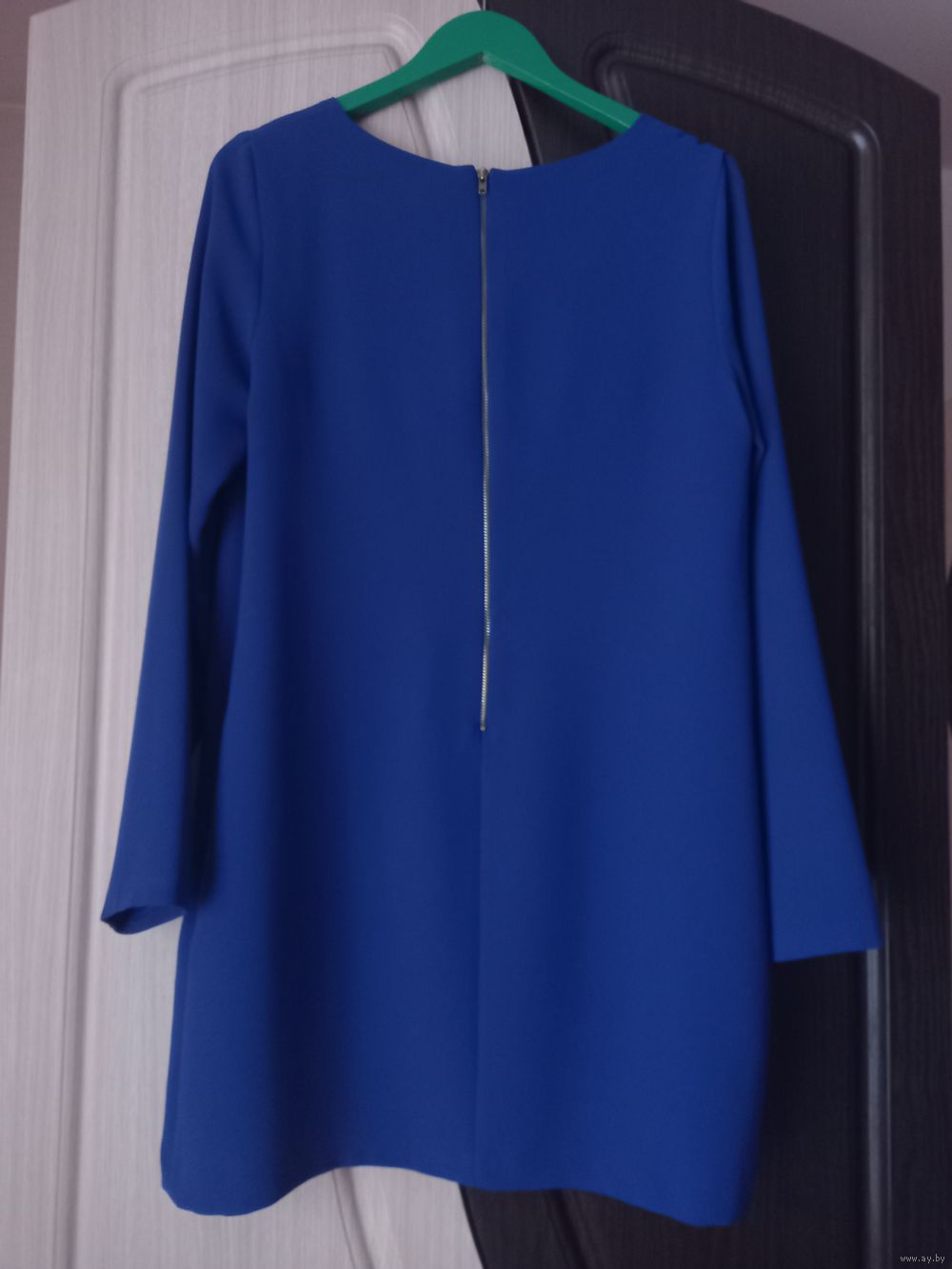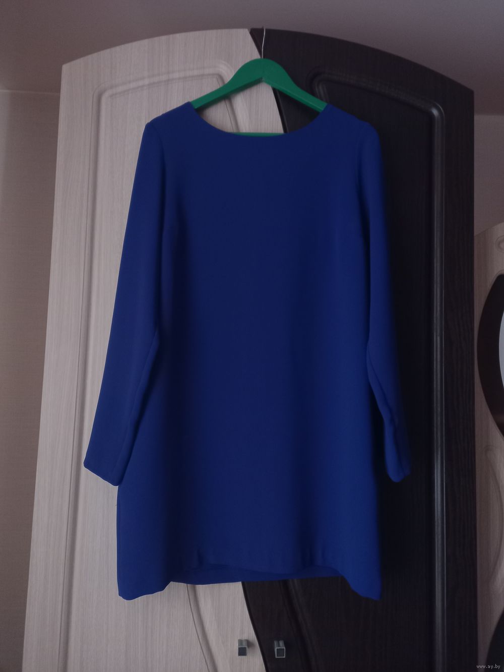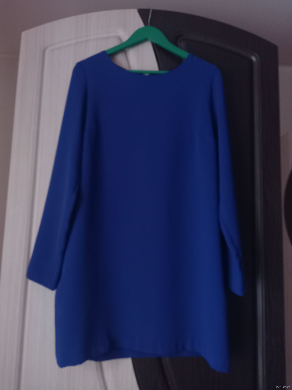 Платье синее.Очень красивое.Можно носить как тунику.Для 46 р-ра будет посвободнее.На 48 лежит также хорошо.Смотрится на фигуре очень красиво. Длина по спинке-81 см, в груди 102 см, бедра:112 см. 100% вискоза.