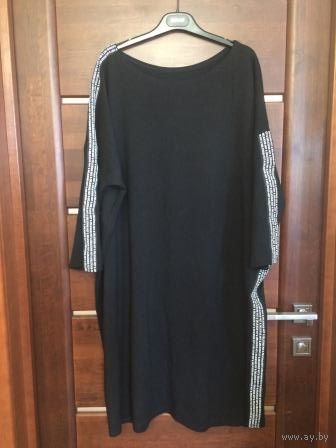 Платье спорт шик на 60-64 размер, пару раз б/у. Очень классное платье, красиво оформлено, сбоку и по рукам белой полосой. Отлично смотрится с кедами, так же и с другой обувью. Мне не подошло по размеру. Ткань плотная, не просвечивает и не сильно облегает. Плотный трикотаж. Длина 100 см, ПОГруди 74 см, тянется до 80 без натяжения, рукав укорочен, ПОбедер 70 см.