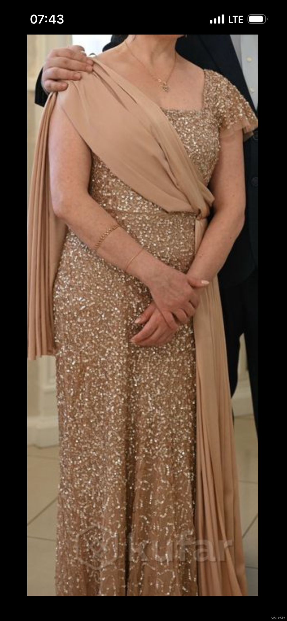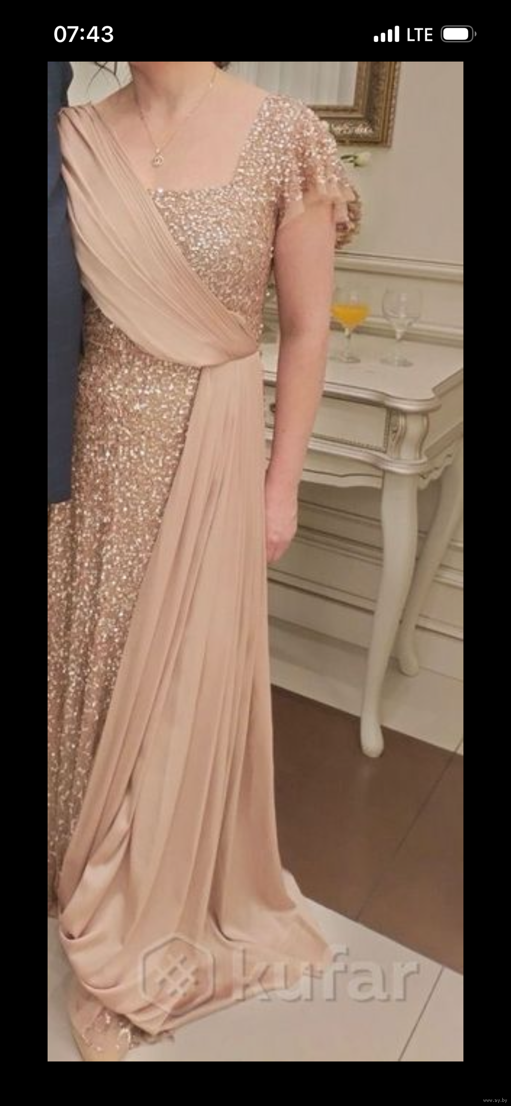 Платье в греческом стиле 46,48,50 размер. Тянется, очень нежное и красивое, и плюс платье для девушки размер 40, 42. В пол, рост у меня 158, была на каблуках и все равно длинное, шлейф пояс длиннее платья. Оно невероятно красивое. Оба платья одной фирмы.