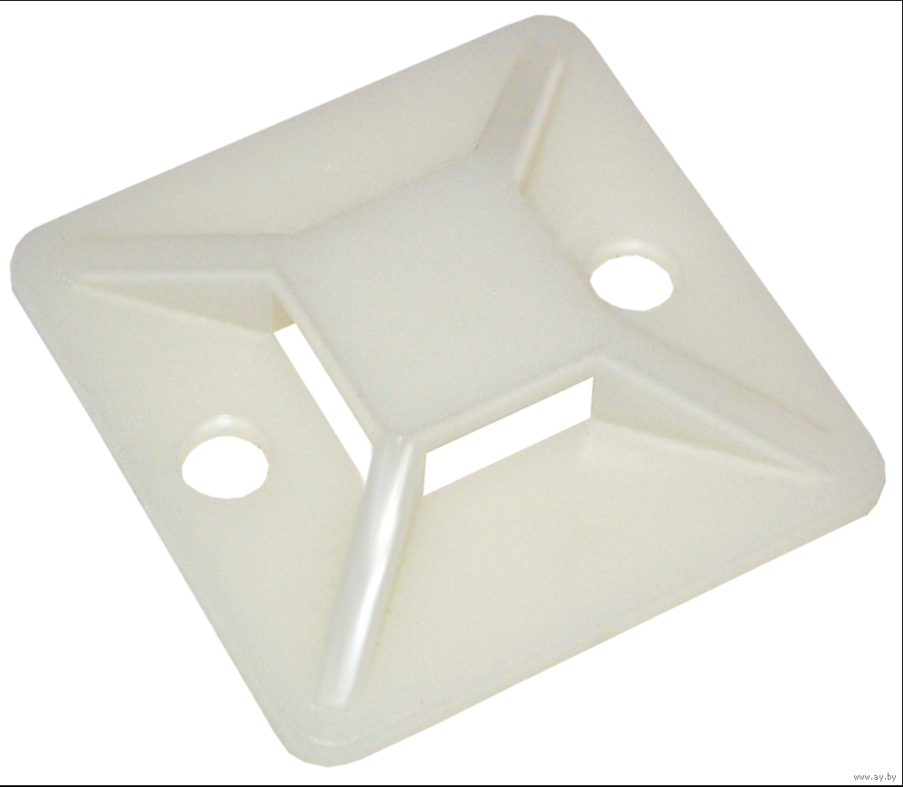 Для крепления хомутов к любой поверхности с помощью самоклеющегося слоя. Полиамид белого цвета, устойчивого к старению, коррозии, воздействию ультрафиолета, солей, щелочей, кислот, бензина, спирта и масел. При необходимости (например, при производстве наружных работ) площадку к поверхности можно закрепить винтом или шурупом, для чего в площадке предусмотрены отверстия.