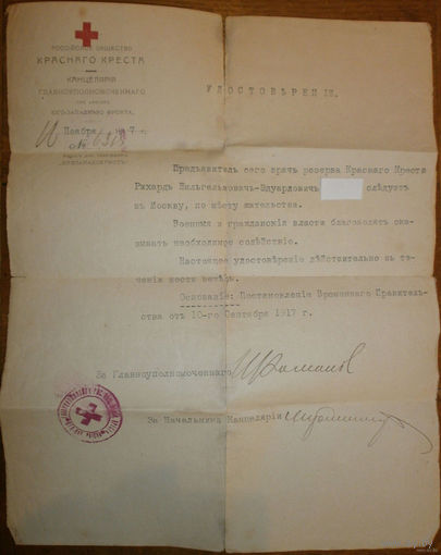 Редкие документы 1917 с подписью Главноуполномоченного (Красный Крест Юго- Западный фронт)