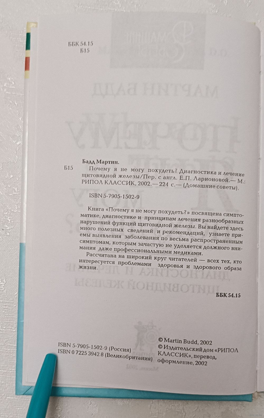 Почему я не могу похудеть? Диагностика и лечение щитовидной железы. Мартин Бадд. М.: РИПОЛ КЛАССИК, 2002. — 224 с. — (Домашние советы), твердый переплет, обычный формат