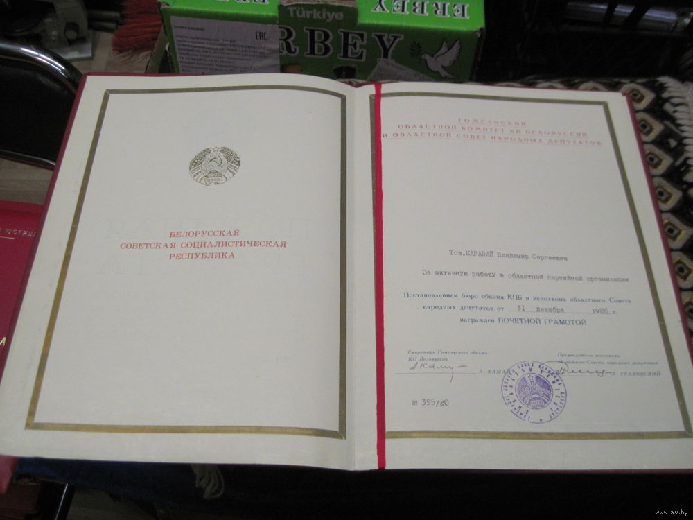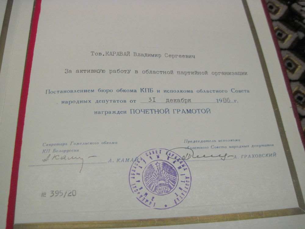 Почетная грамота 1986 г известному государственному деятелю БССР и РБ. Торги!