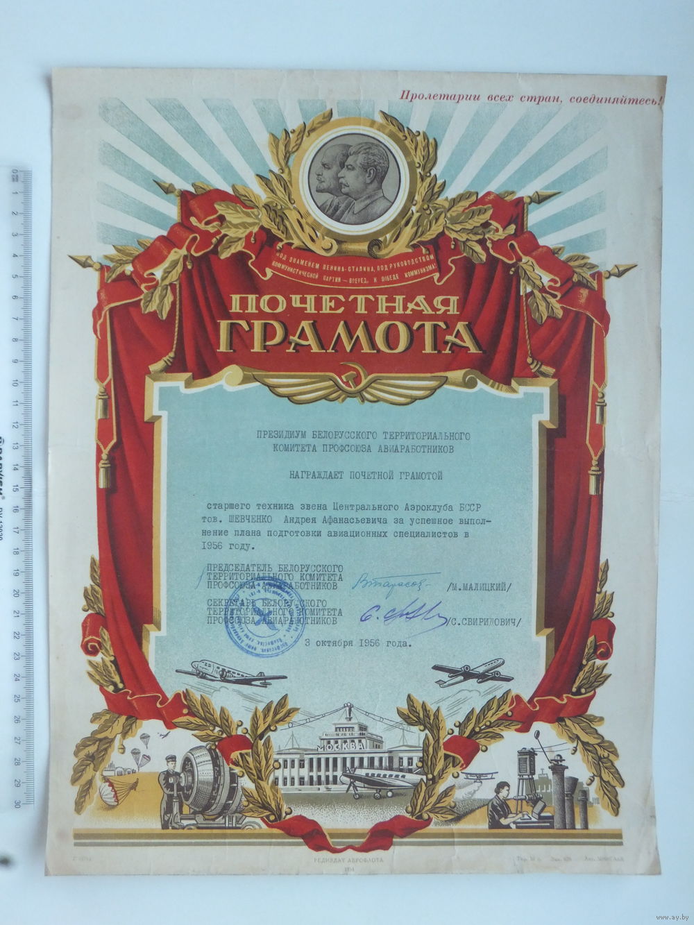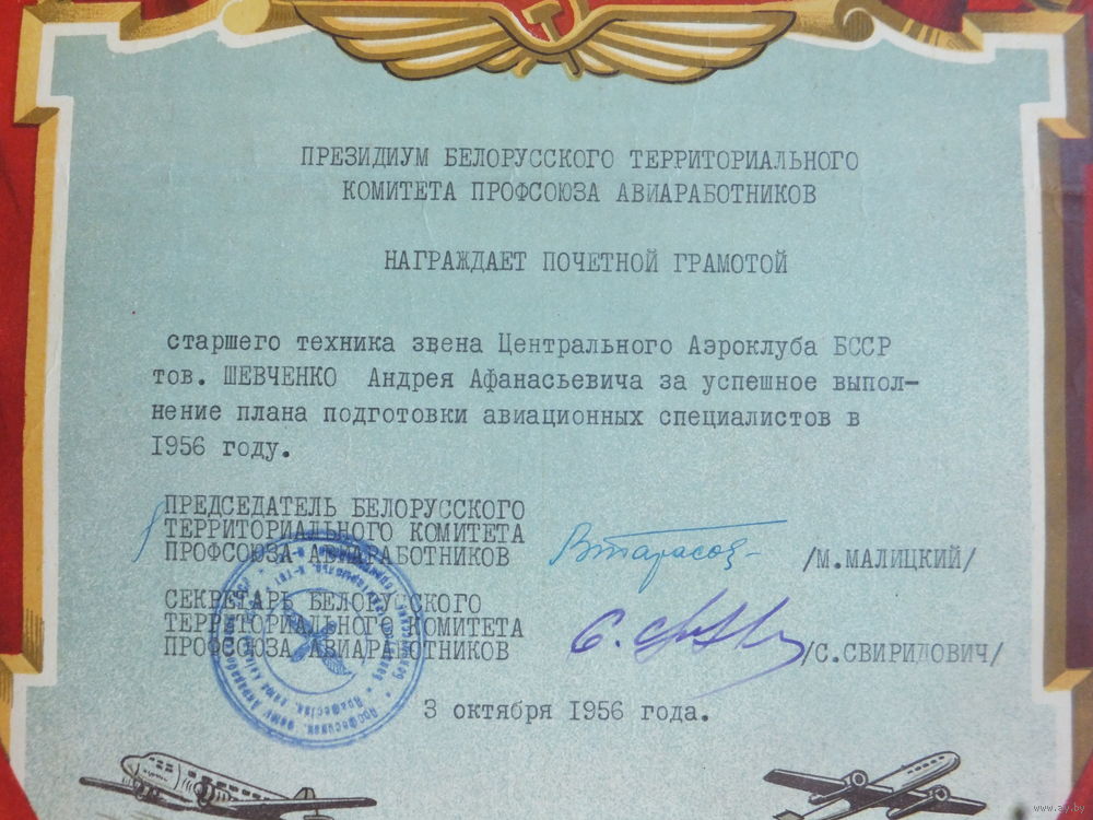 Почетная грамота центральный аэроклуб БССР 1956 г