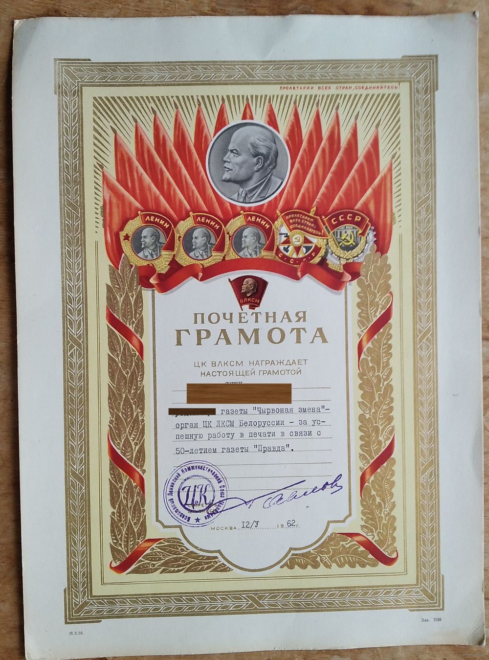 Почетная грамота ЦК ВЛКСМ. 1962 г.