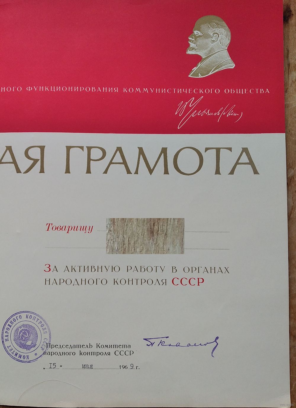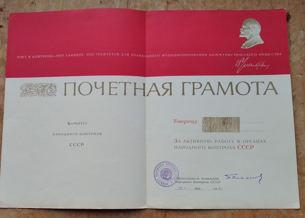 Почетная грамота Комитета Народного контроля СССР. 1969 г.