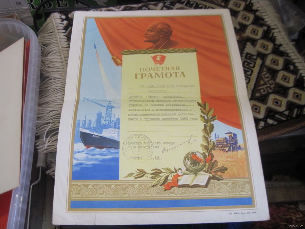 Почетная грамота от Минского обкома ЛКСМБ 1982 г. с рубля!
