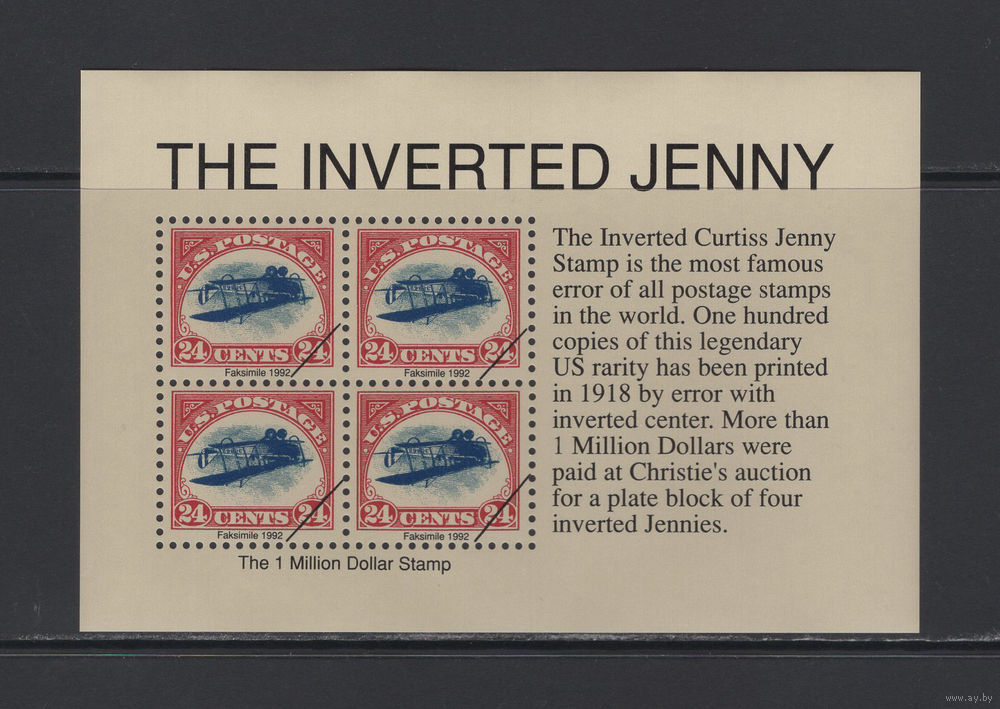 Почта США 1992** Выставочный блок марка США 1918 года за миллион долларов "Перевёрнутая Дженни" Факсимиле