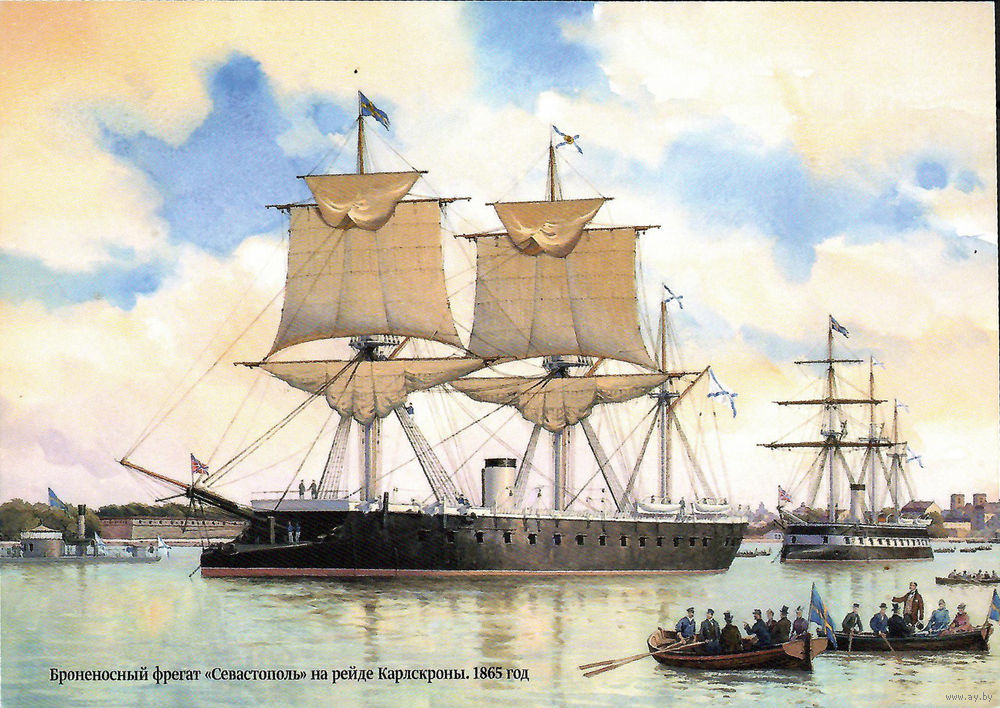 Почтовая карточка "Броненосный фрегат "Севастополь" на рейде Карлскроны. 1865 год"
