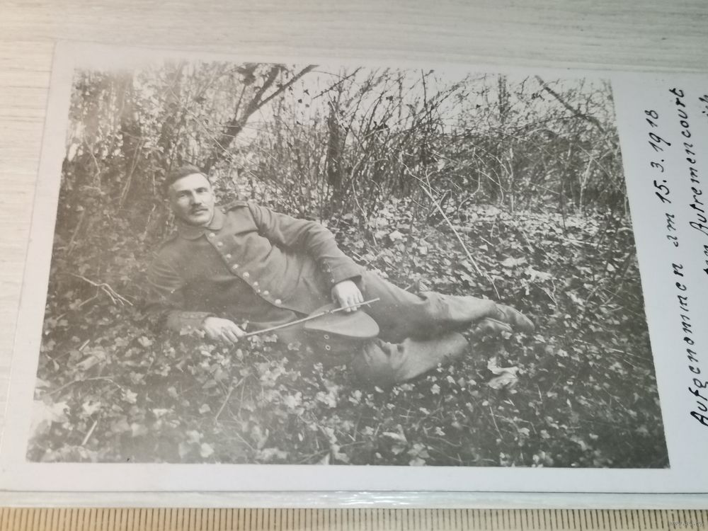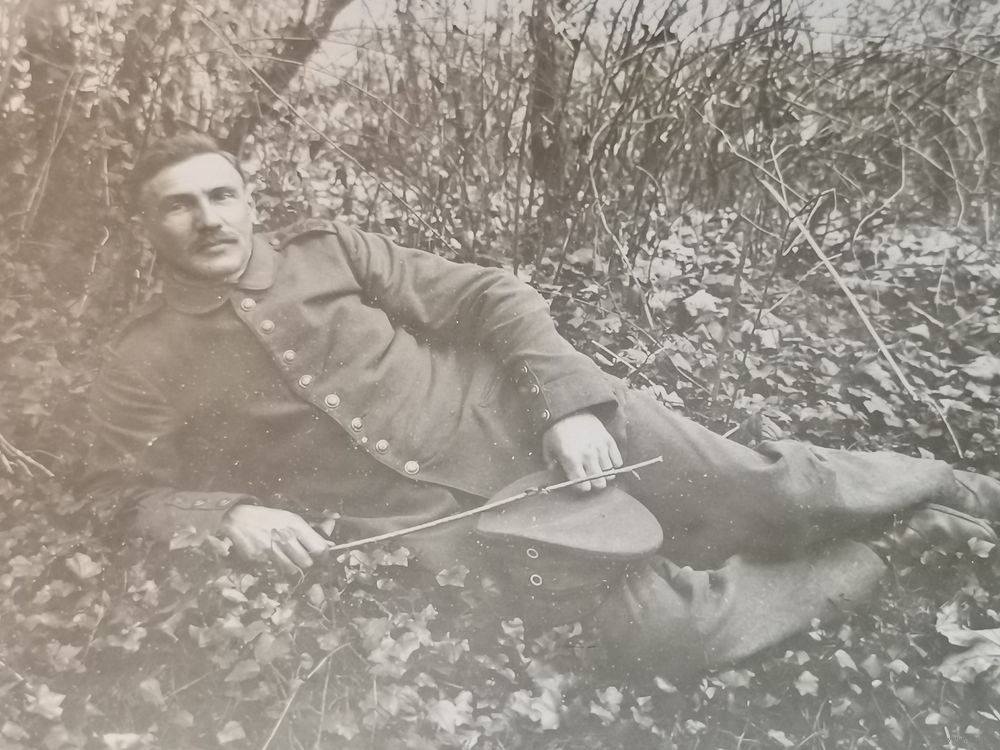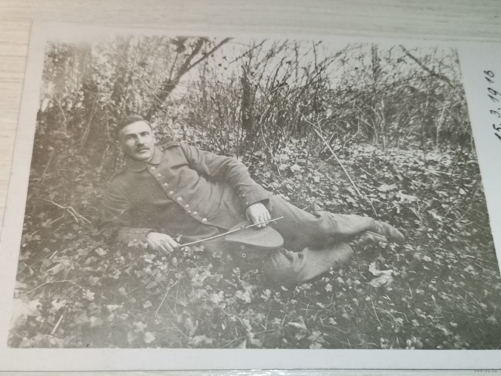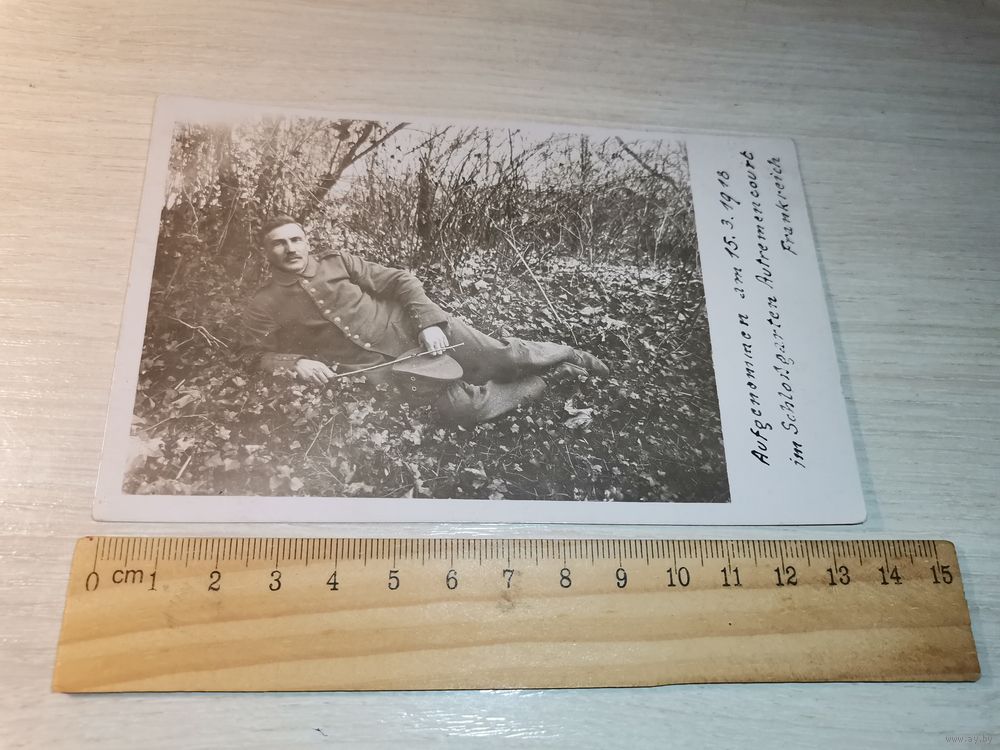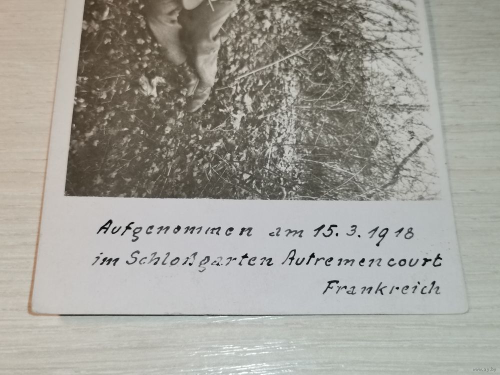 Почтовая карточка, фотография с изображением военнослужащего, до 1918 года., Замковый сад в Отрменкуре, Франция.