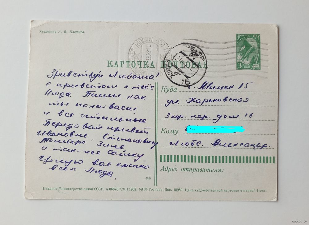 Почтовая карточка. Художник А.В.Плетнёв. 1962 г.