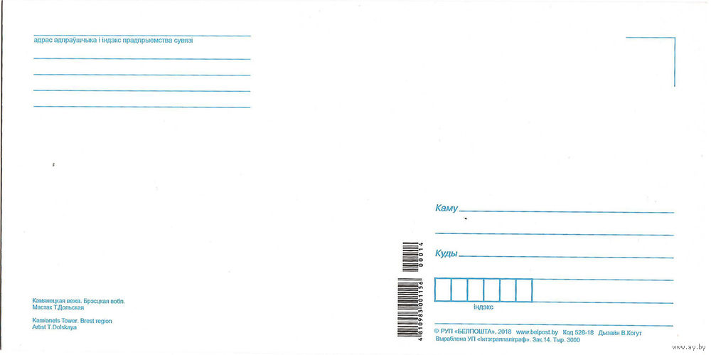 Почтовая карточка "Камянецкая вежа. Брэсцкая вобл."
