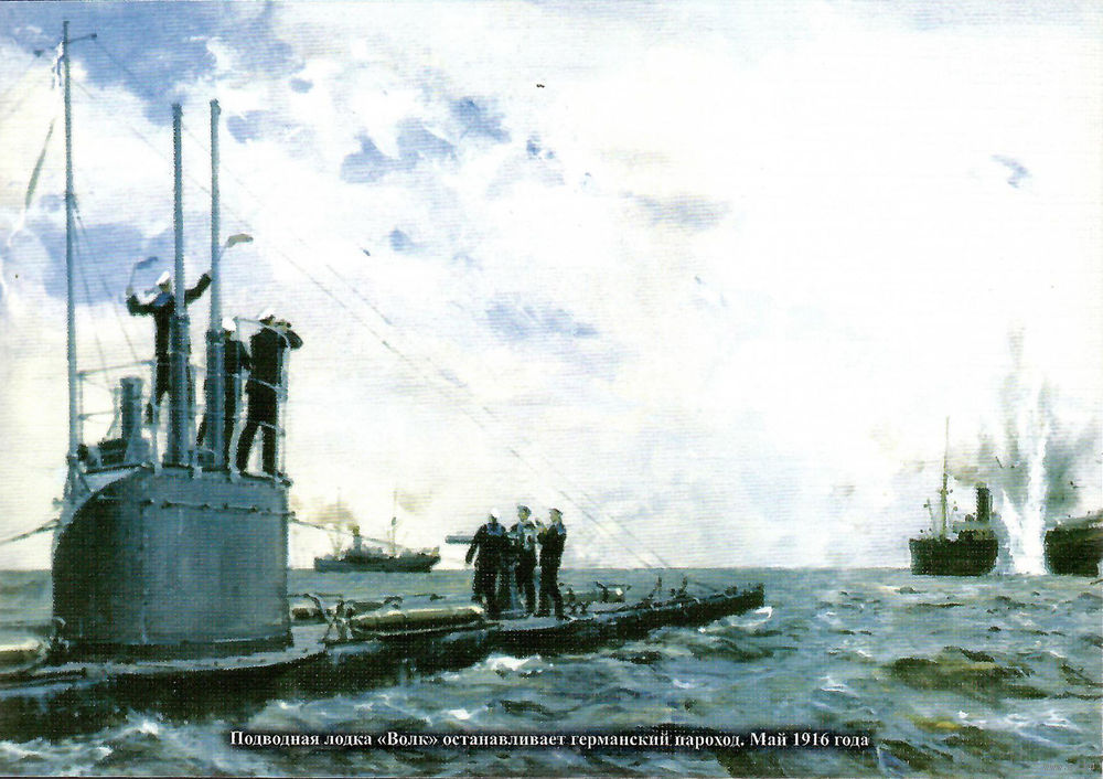 Почтовая карточка "Подводная лодка "Волк" останавливает германский пароход. Май 1916 года"