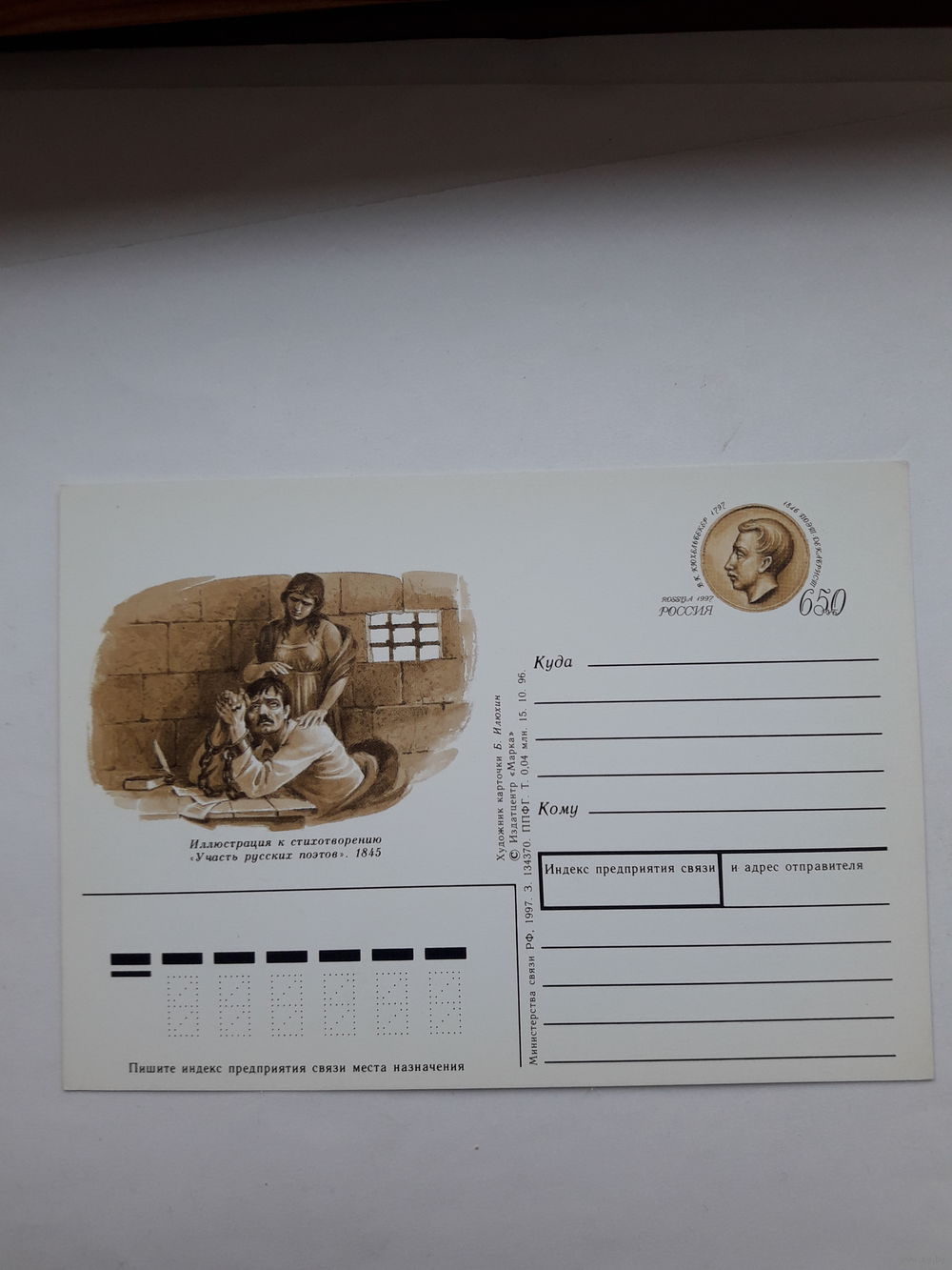 Почтовая карточка РФ 1997 Кюхельбекер поэт декабрист