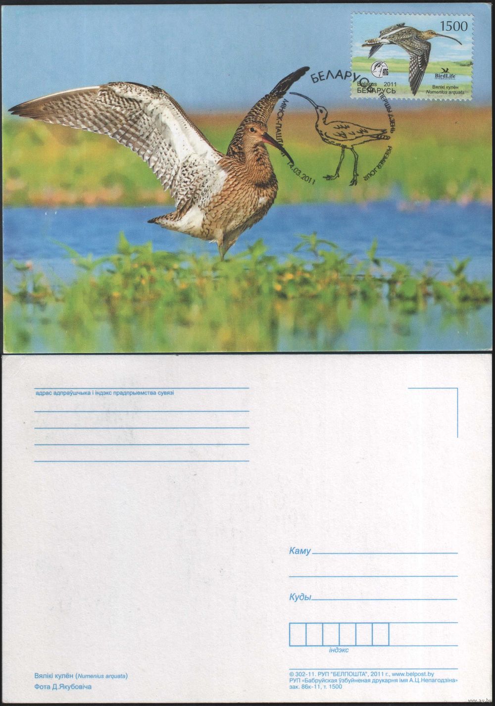 Почтовая карточка с гашеной маркой !первый день! Большой кроншнеп 2011 год. Беларусь