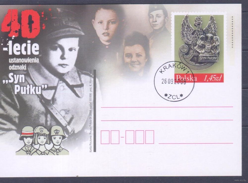 Почтовая карточка с ОМ Польша 2008г. Дети войны.Знак Сын полка.