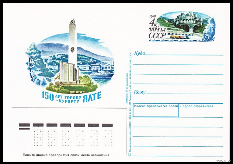Почтовая карточка с оригинальной маркой. 150-летие города-курорта Ялта.1988 год