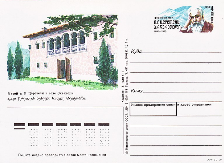 Почтовая карточка с оригинальной маркой. 150-летие со дня рождения грузинского поэта А. Р. Церетели.1990 год