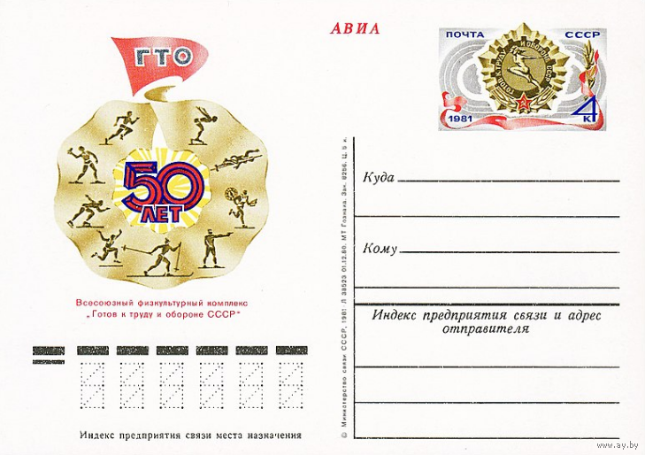 Почтовая карточка с оригинальной маркой. 50-летие Всесоюзного физкультурного комплекса (ГТО).