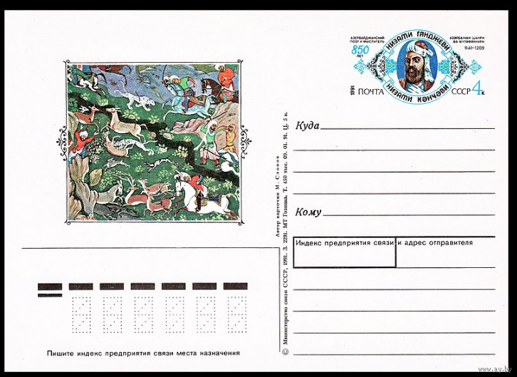 Почтовая карточка с оригинальной маркой. 850-летие со дня рождения Низами Гянджеви. 1991 год