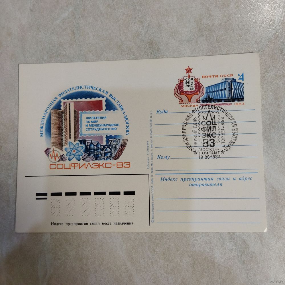 Почтовая карточка с оригинальной маркой. Международная филателистическая выставка Соцфилэкс-83 в Москве.1983 год