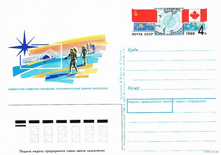 Почтовая карточка с оригинальной маркой. Советско-канадская арктическая лыжная экспедиция.1988 год