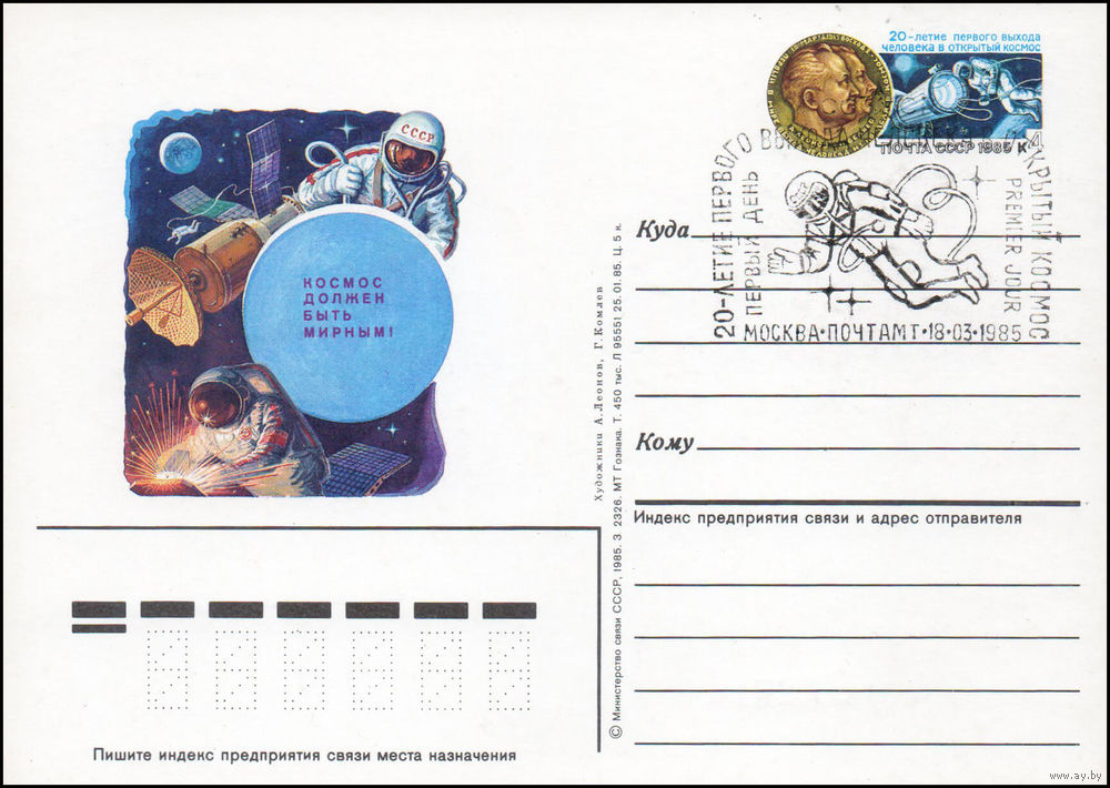 Почтовая карточка СССР с оригинальной маркой и спецгашением N 145 (18.03.1985) "20-летие первого выхода человека в открытый космос"