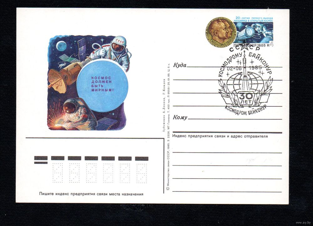 Почтовая карточка СССР с оригинальной маркой и спецгашением N 145 (18.03.1985) "20-летие первого выхода человека в открытый космос"