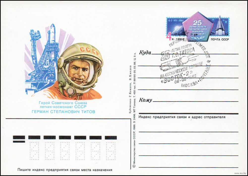 Почтовая карточка СССР с оригинальной маркой и спецгашением N 159 (06.08.1986) "20-летие полета Г. Титова на космическом корабле "Восток-2"