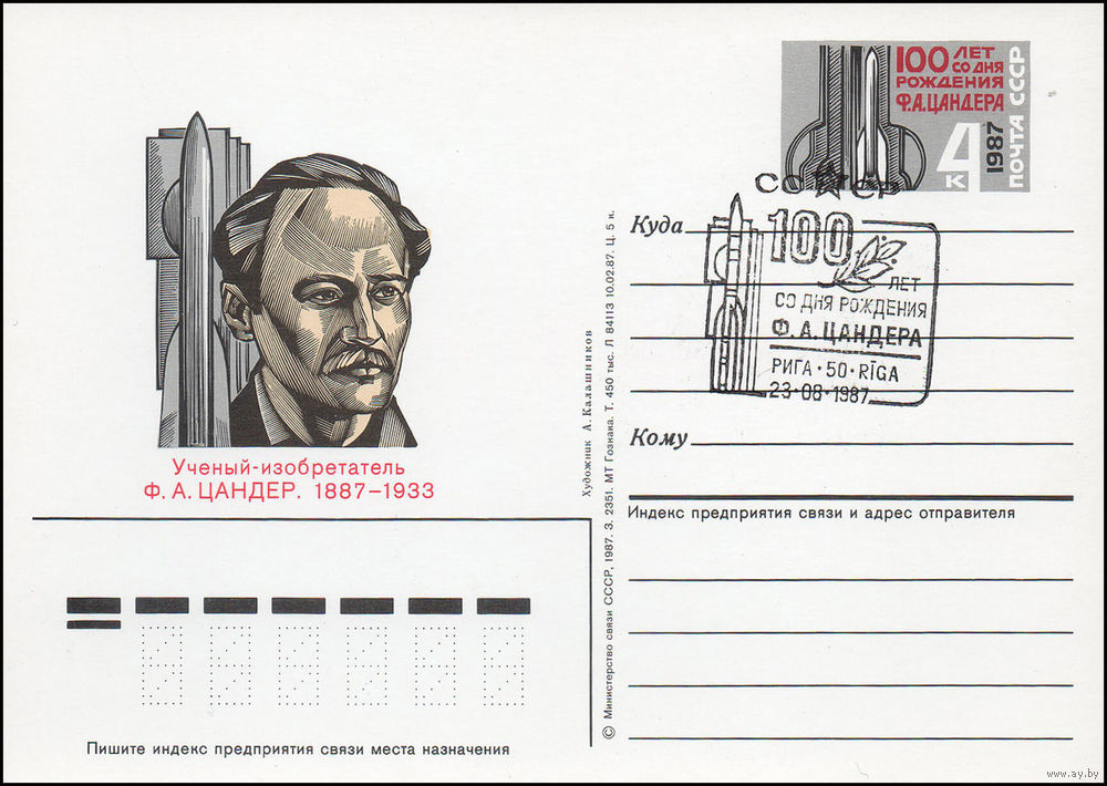 Почтовая карточка СССР с оригинальной маркой и спецгашением N 167 (23.08.1987) "100 лет со дня рождения изобретателя ракетной техники Ф. Цандера"