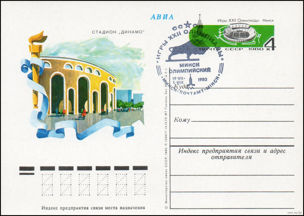 Почтовая карточка СССР с оригинальной маркой и спецгашением N 82 (12.06.1980) "Игры XXII Олимпиады. Спортивные сооружения. Минск"
