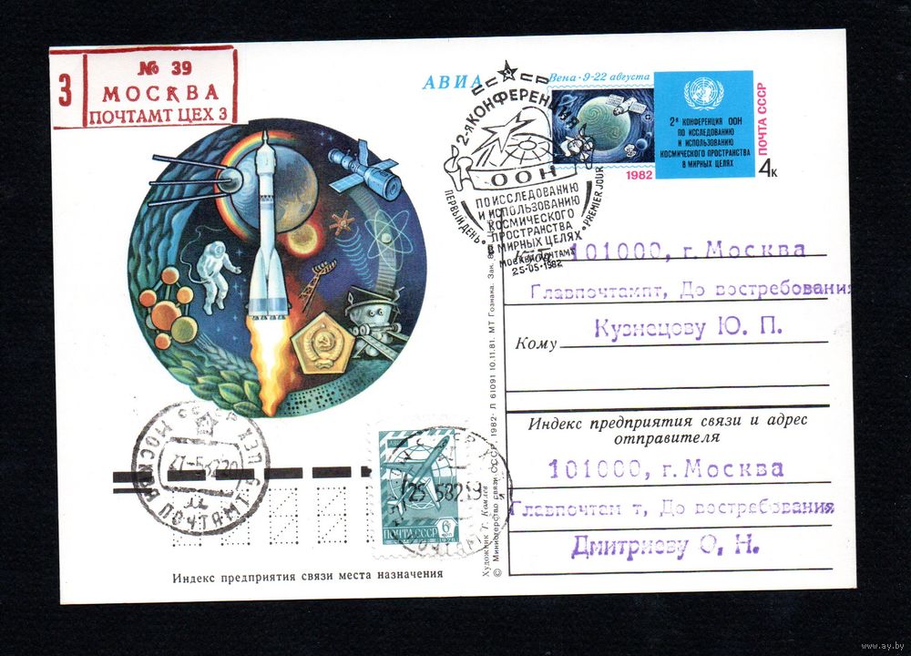Почтовая карточка СССР с оригинальной маркой и спецгашением прошедшая почту N 103 (25.05.1982) "Исследование космоса в мирных целях"