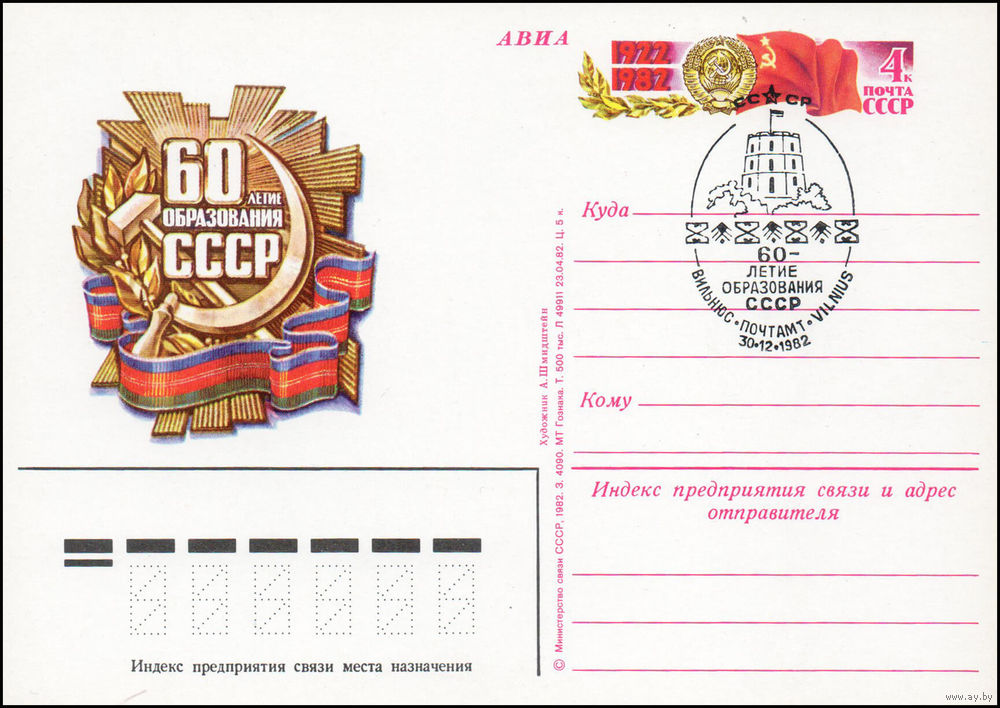 Почтовая карточка СССР с оригинальной маркой N 110 и спецгашением (03.12.1982) 60 лет образования СССР