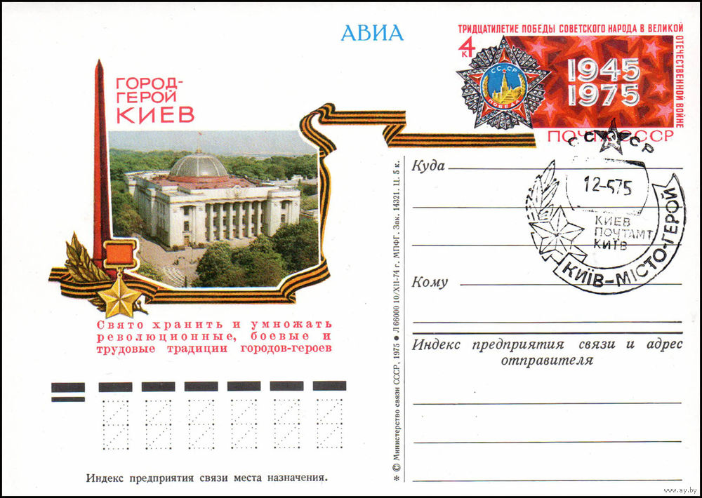 Почтовая карточка СССР с оригинальной маркой N 22 (05.05.1975) Город-герой Киев