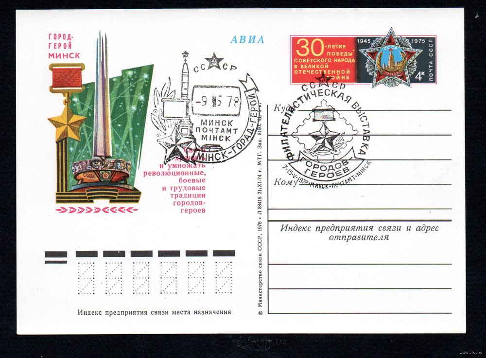 Почтовая карточка СССР с оригинальной маркой N 23 и спецгашением (05.05.1975) Город-герой Минск