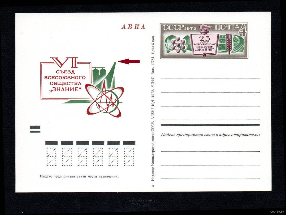 Почтовая карточка СССР с оригинальной маркой N 5 (26.05.1972) "25 лет Всесоюзному обществу "Знание" с разновидностью