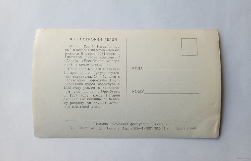 Почтовая карточка Ю.А.Гагарин 1961 год.