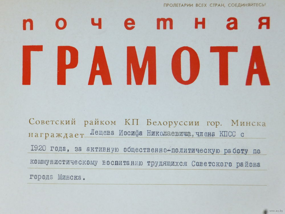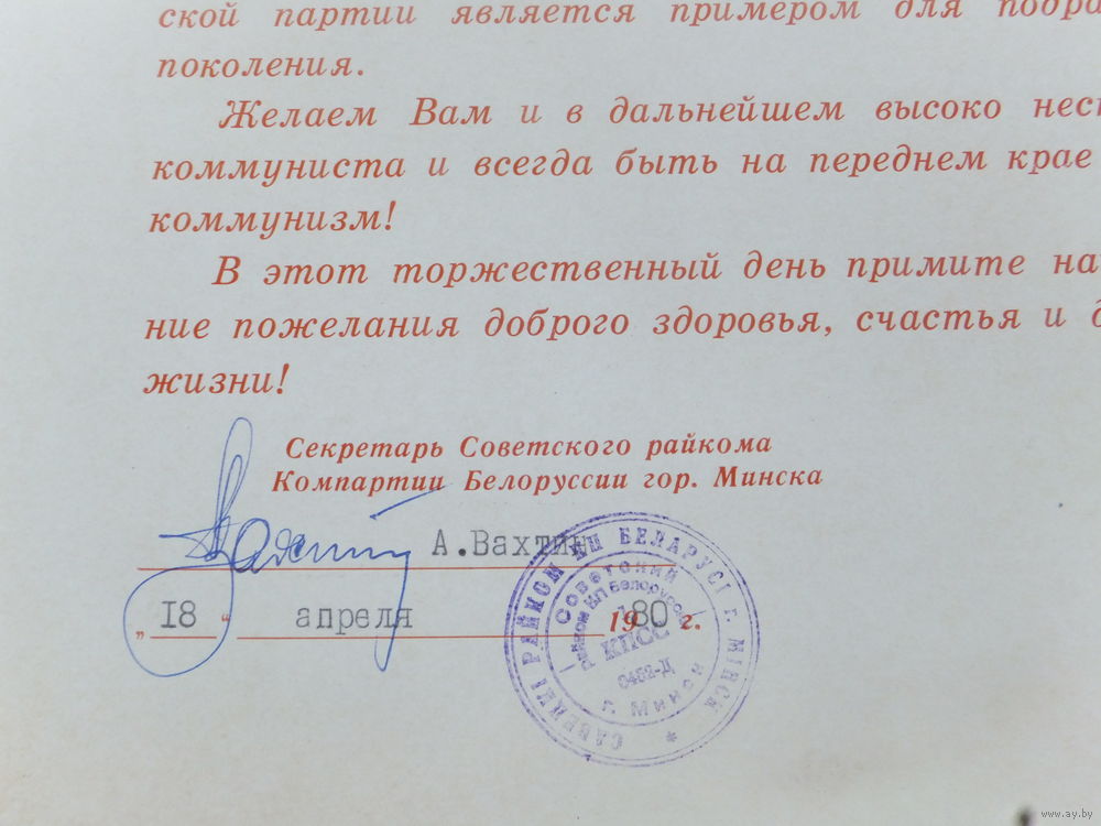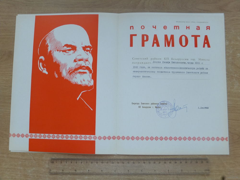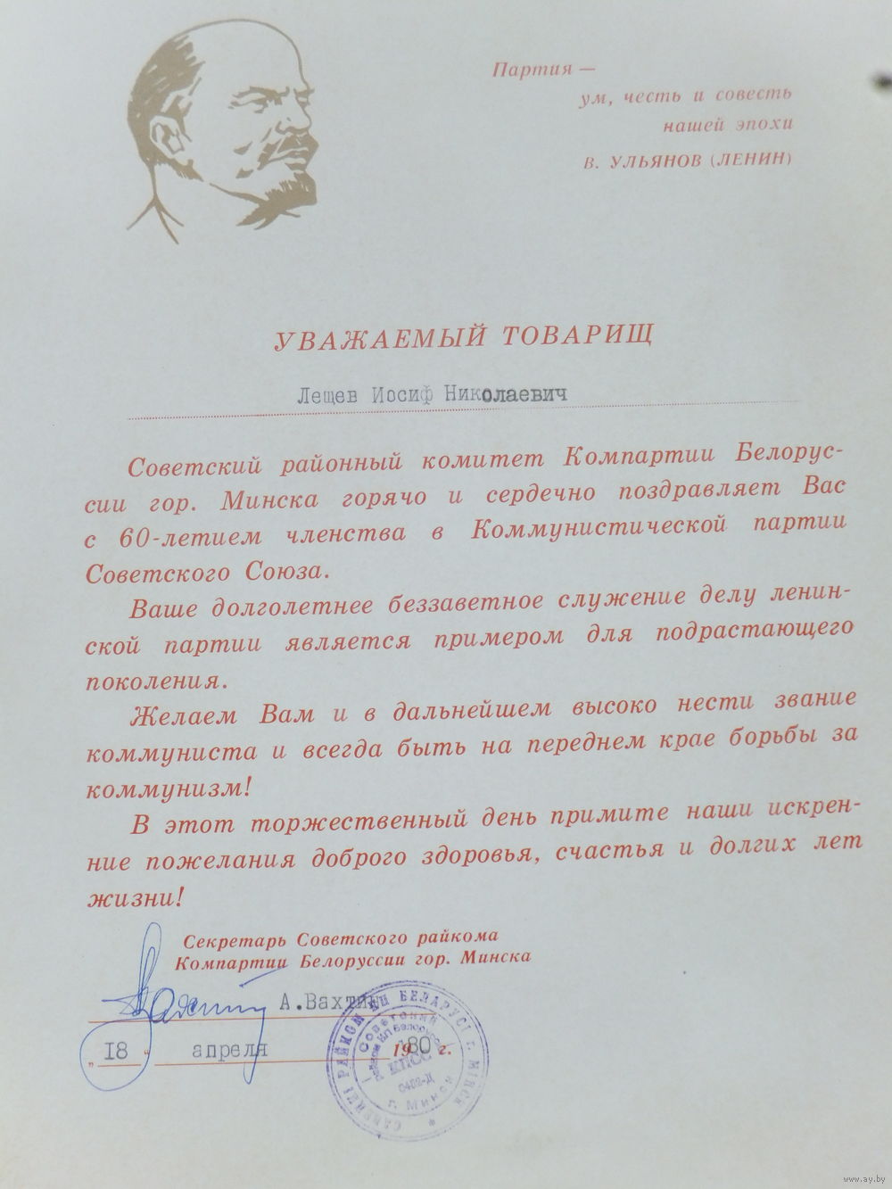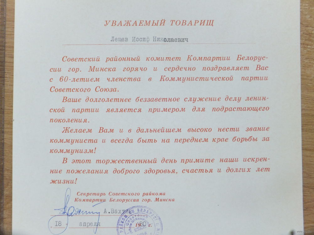 Почётная грамота за стаж 60 лет в КПСС Минск 1980 г