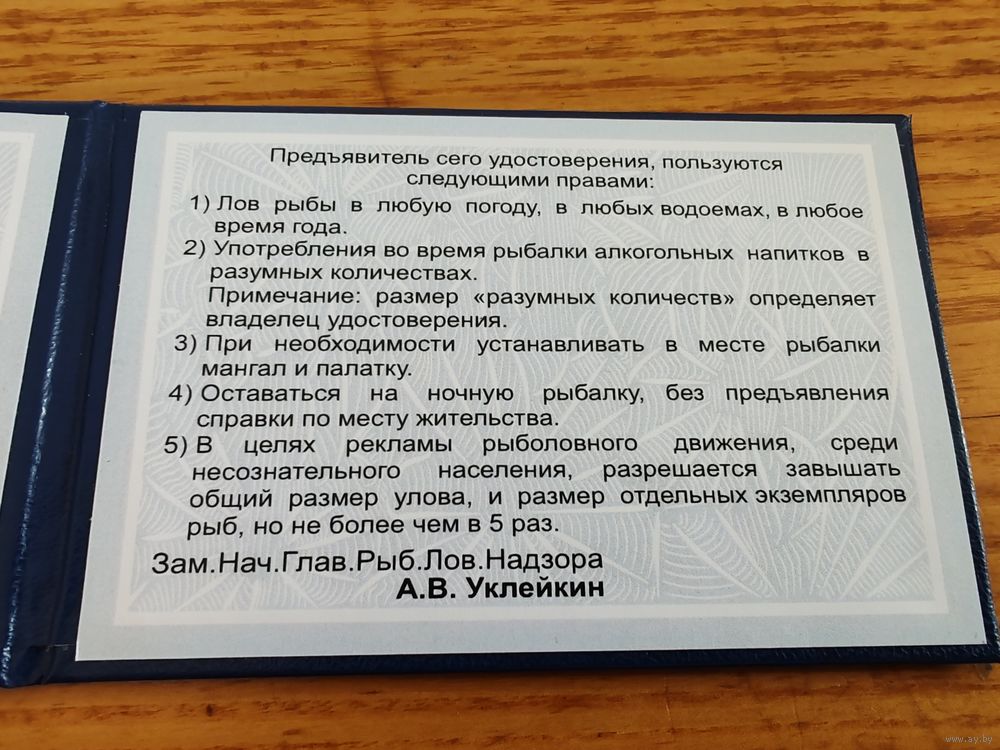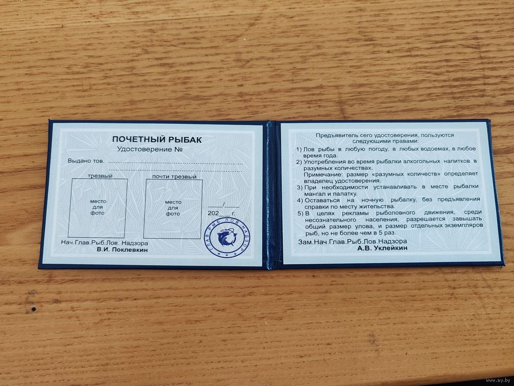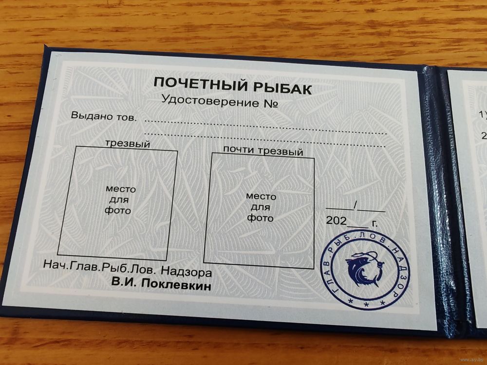 Удостоверение Почётный Рыбак, шуточное