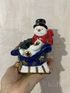 Подсвечник разноцветный веселый Снеговик везет подарки на санях и внутри есть золотая круглая свеча. Высота 14см, длина 11см, ширина 6см.