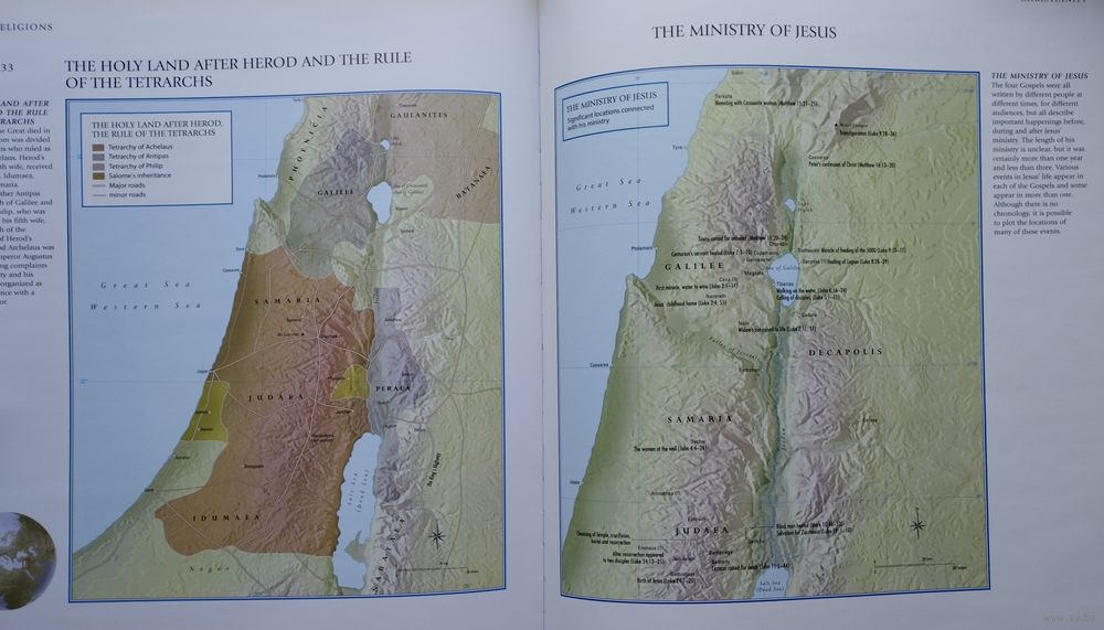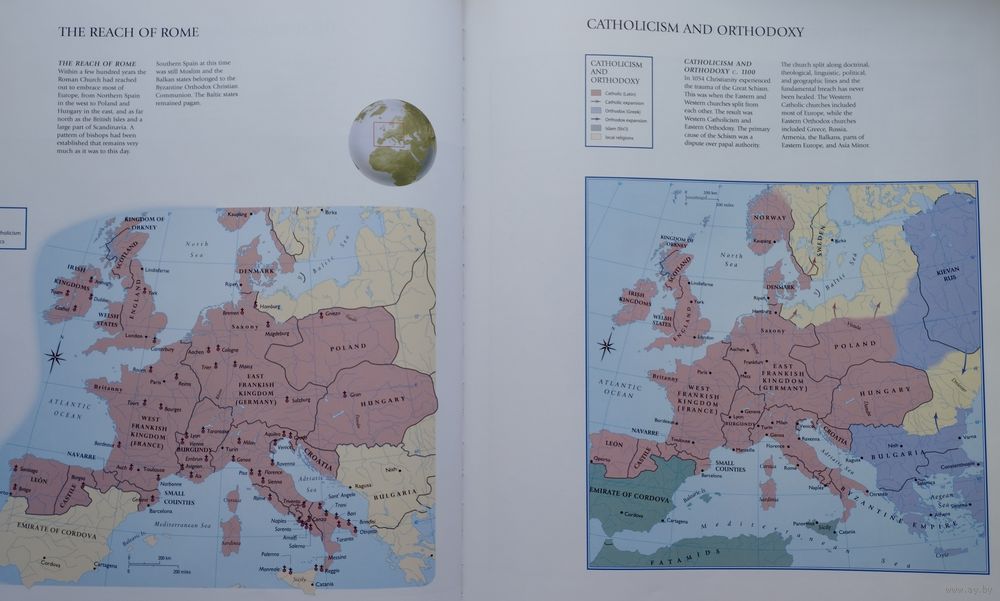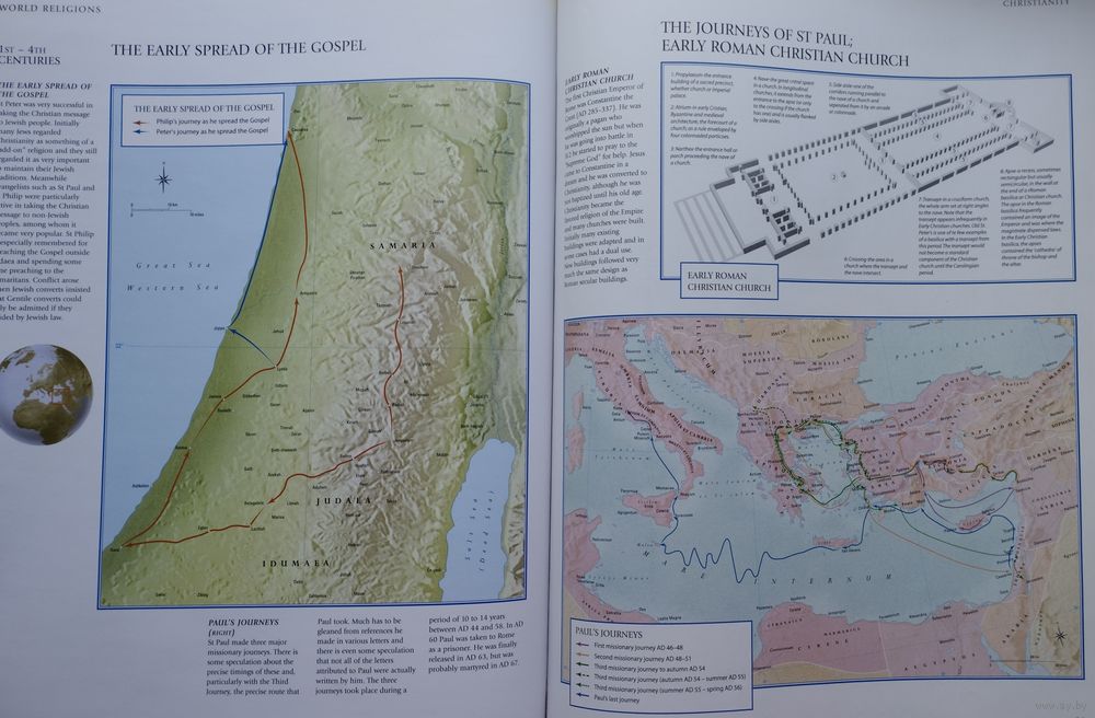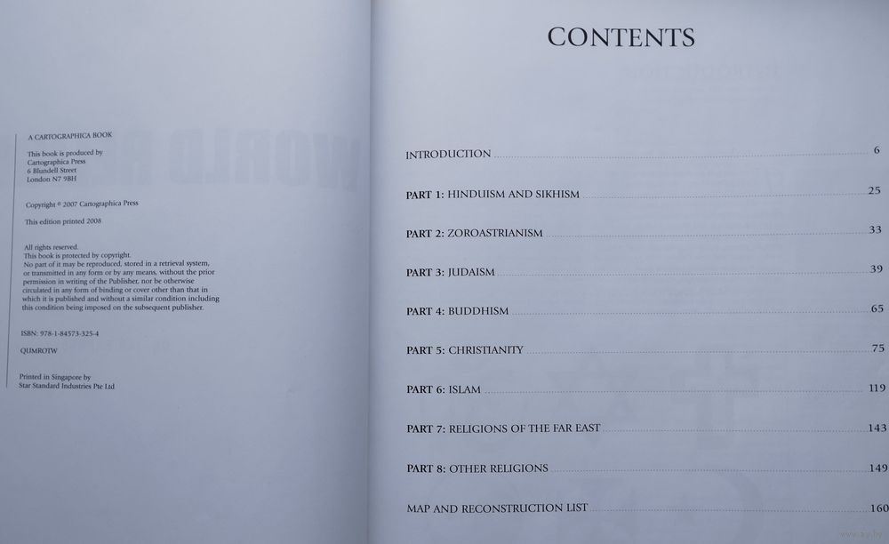 Подарочное издание. Отпечатано в Сингапуре. Большой энциклопедический формат. Мелованный альбом. Ляссе. Тираж 1000 экз. 168 стр. Более 150 уникальных карт прослеживают историю мировых религий, включая все основные религии, проиллюстрированные фотографиями и рисунками.