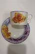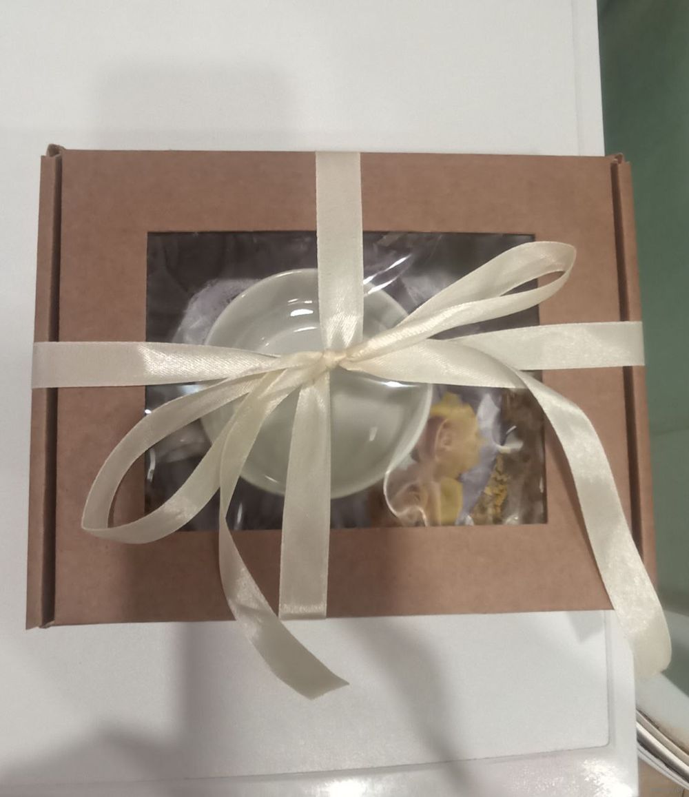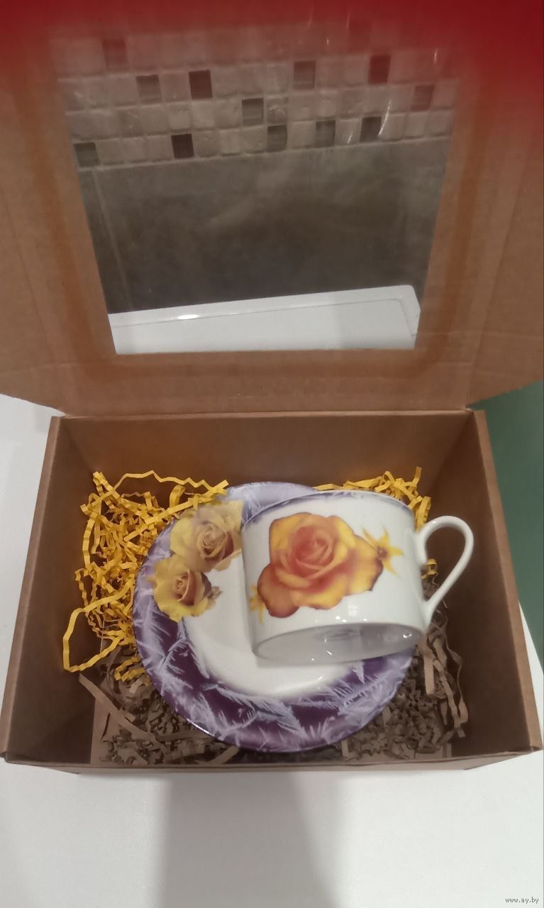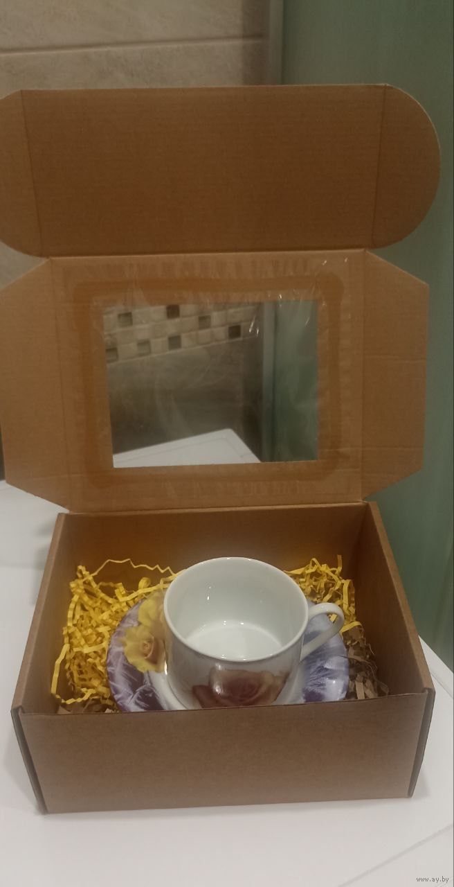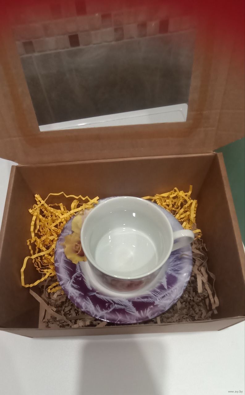 Чайная пара - чашка и блюдце, упакованы в коробку с прозрачной крышкой и наполнителем, перевязаны лентой.