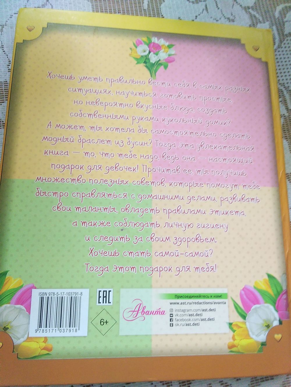 Развивающая книга для девочек младшего школьного возраста научит поведению,общению,готовить еду,плетению и многим другим полезным вещам.Книга большого формата 26*20 см с яркими картинками читается девочками на одном дыхании.