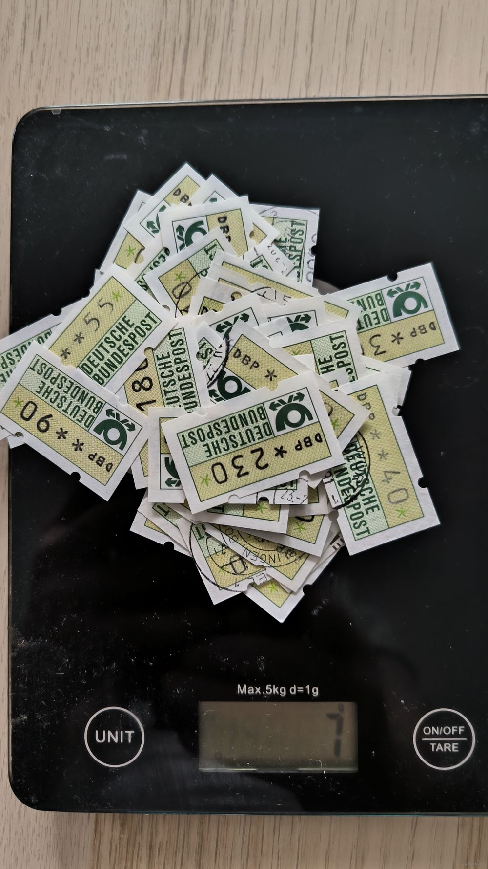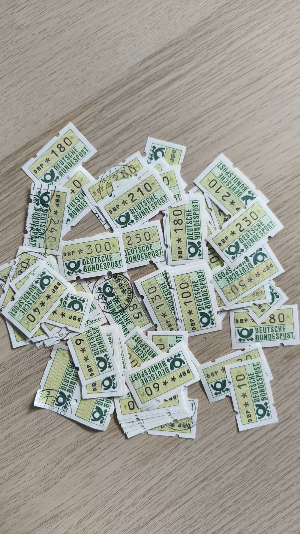 Большая подборка оригинальных автоматных марок (Automatenmarken / ATM) Федеративной Республики Германии. Данная серия с изображением почтового рожка (Posthorn) на фоне защитной сетки была первым выпуском такого типа в ФРГ. Марки печатались специальными терминалами, что позволяло получать номиналы в широком диапазоне.Характеристики: