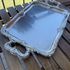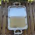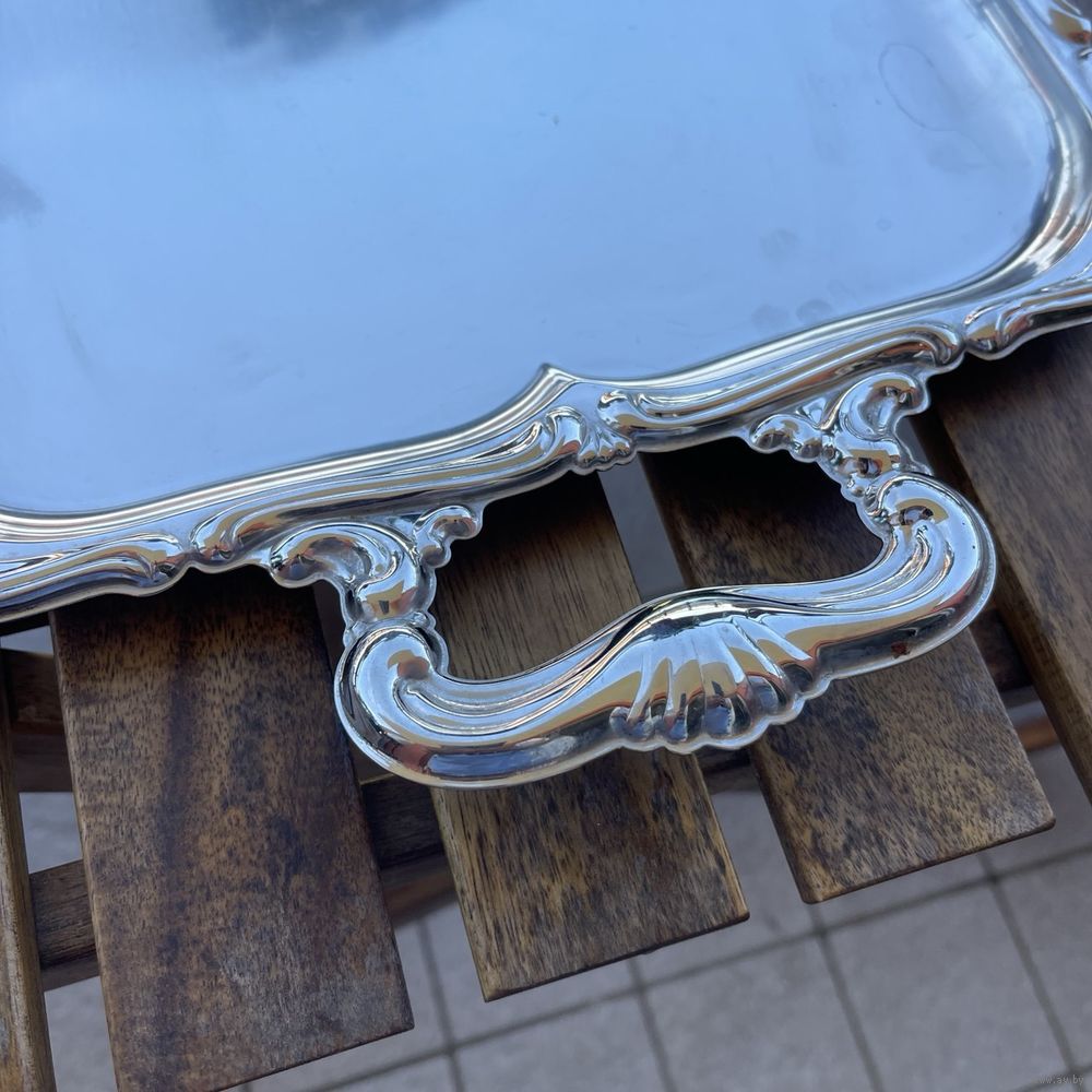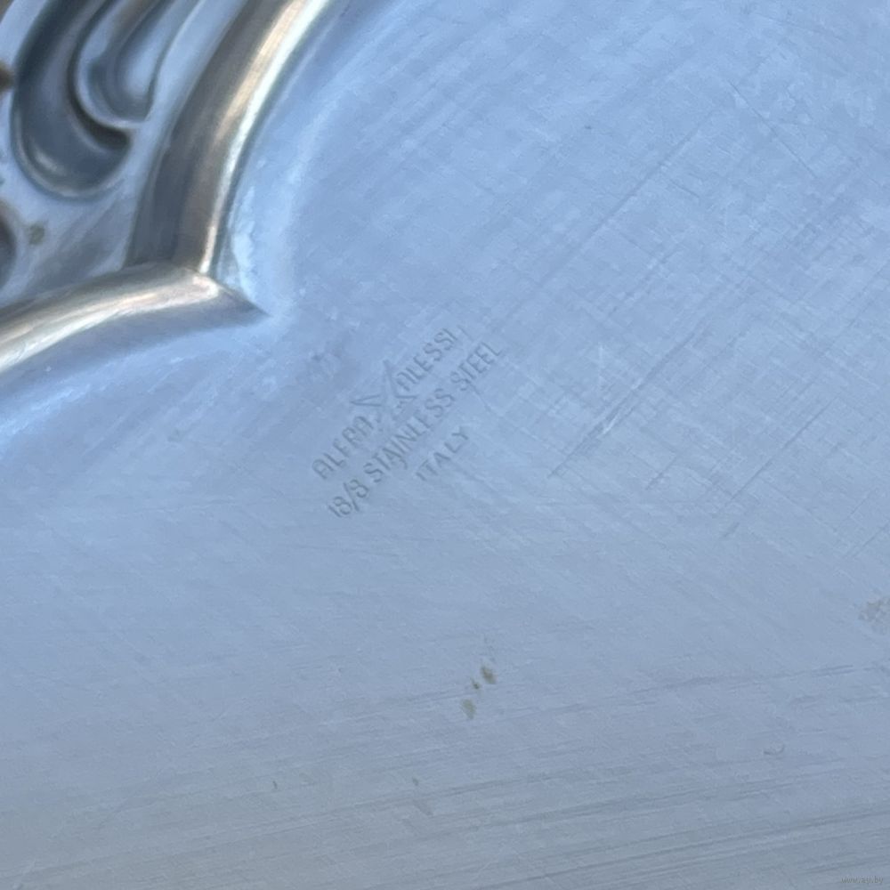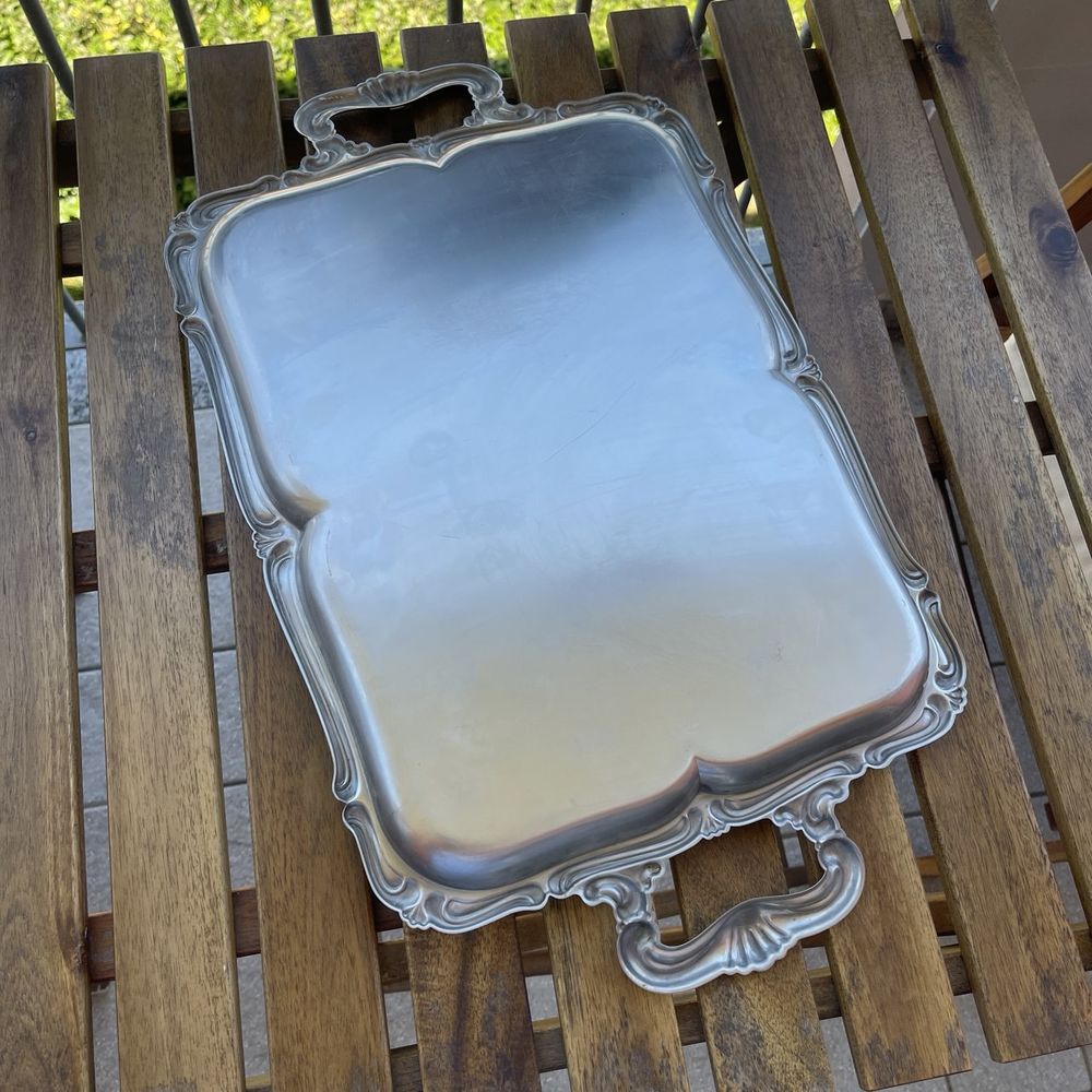 Винтажный поднос для завтрака из нержавеющей стали с фигурными ручками и рельефным декором по краю. Италия. 1970-е г.г. Клеймо. Размер с ручками 52 х 30,5 см. Размер полезной части 40 х 30,5 см. Естественная патина, незначительные следы бытования.