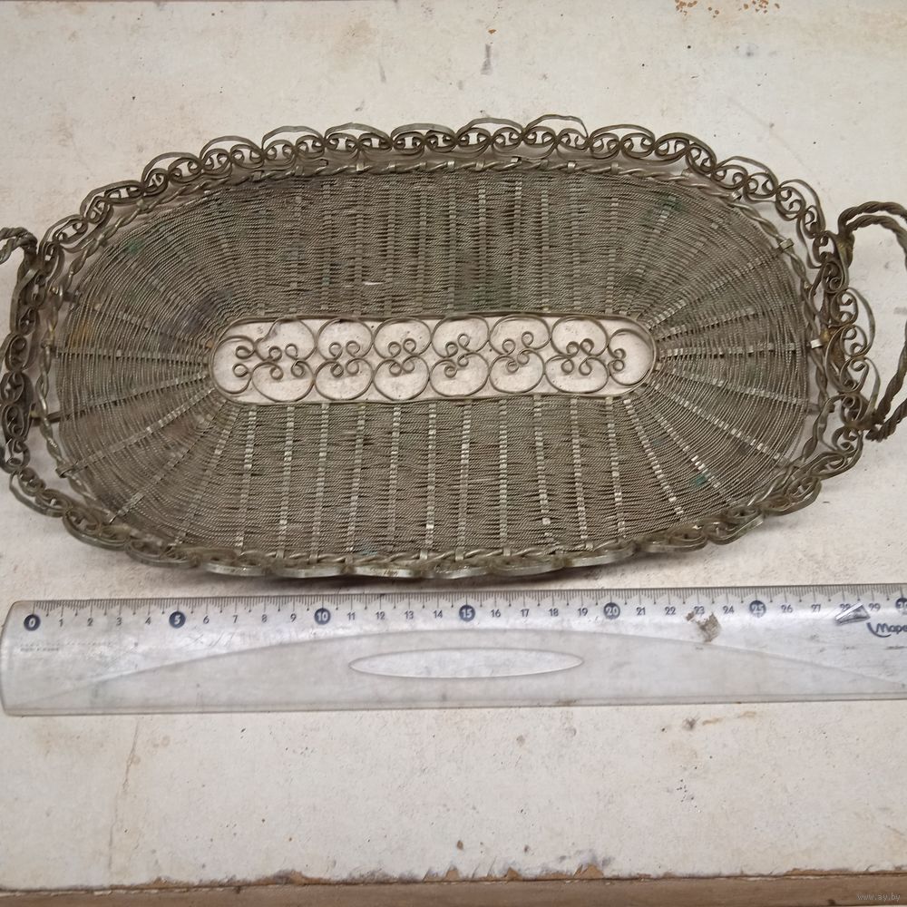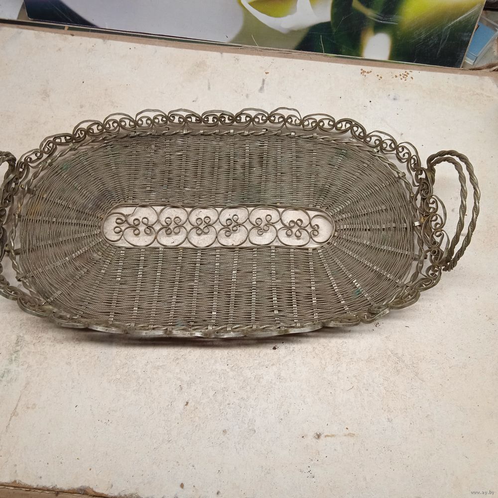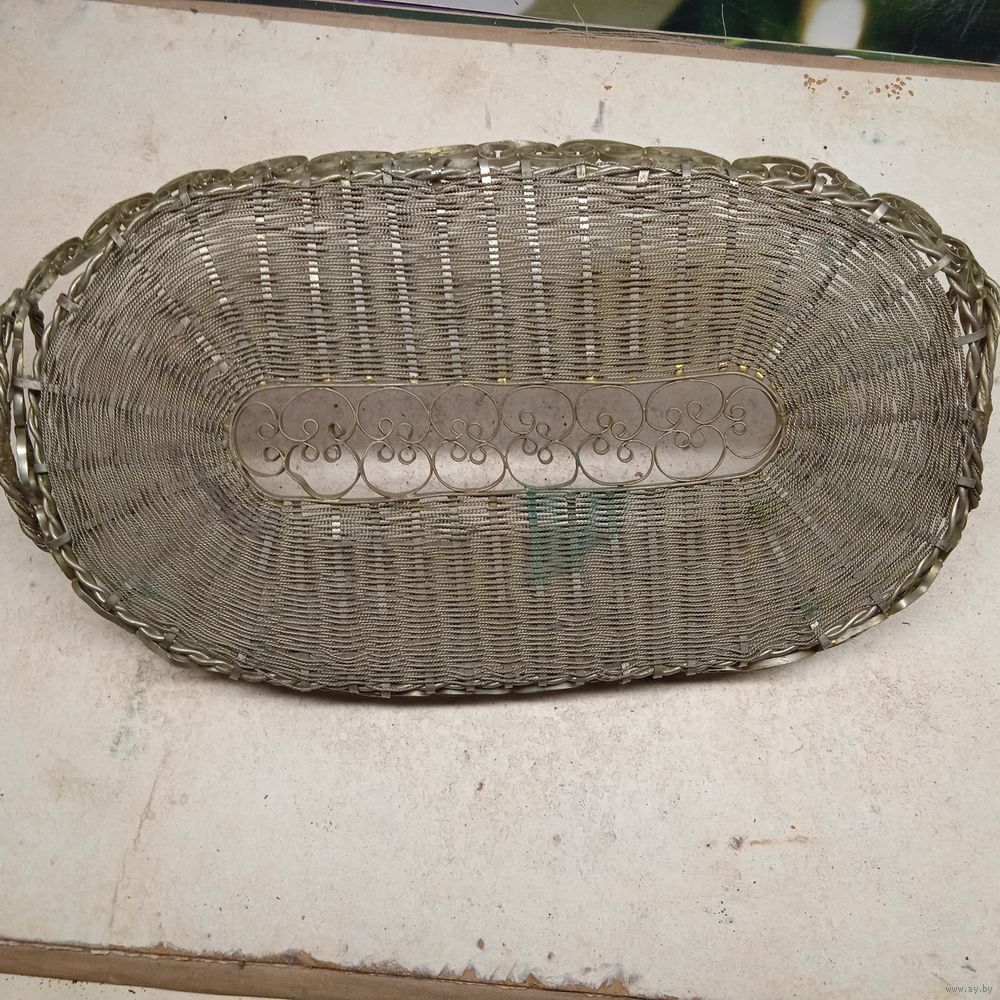 Поднос .Фруктовница Хлебница Сухарница. Мельхиор. Мельхиоровая сухарница, времён СССР, скань, размер с ручками 36*16.5 см.